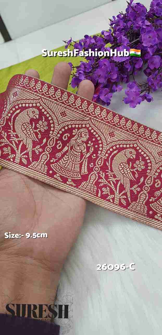 Enhanced with a *golden Banarasi touch, the design appears rich and festive, making it perfect for premium garments. With its **9.5 cm broad width*, it creates a bold and eye-catching border that stands out beautifully.