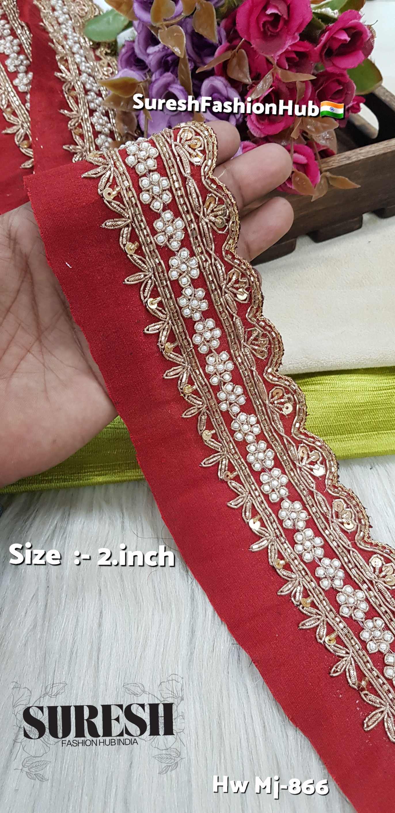 *Mj-866* is a *pure handmade, one-side scalloped designer zardosi border, created by combining **three different handmade laces into one single fabric*. This unique fusion technique gives every piece a premium couture appearance.