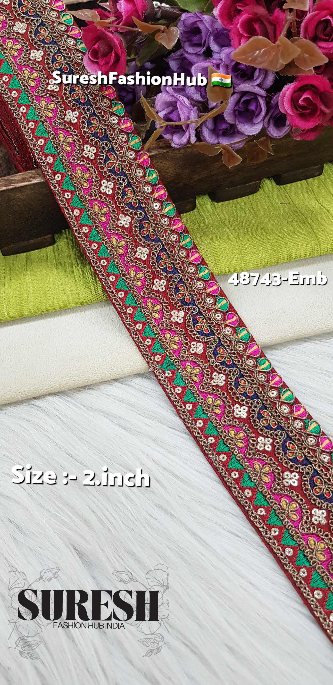 Presenting our *48743-Emb Sabyasachi Inspired Premium Embroidery Lace, a stunning 2-inch designer border crafted to elevate any ethnic or couture garment. Priced at **Rs 1300 for 9 meters, this lace has been developed in **nine rich fabric colors*, giving customers a wide choice to match their outfits perfectly.