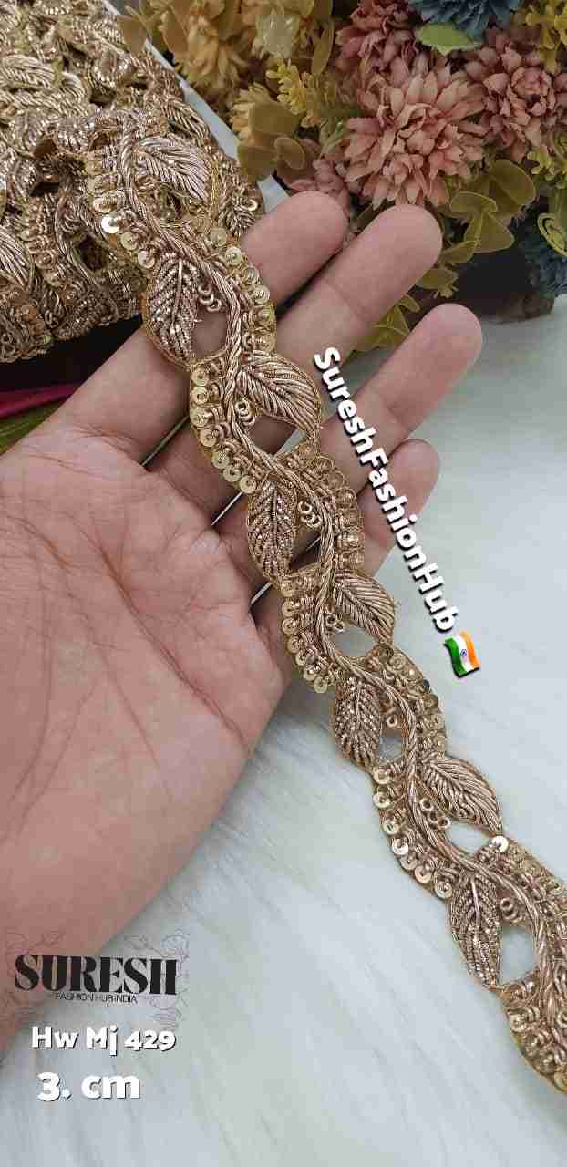 Design *Mj-429* is a *luxurious dual-side handmade cutwork border lace, meticulously crafted on a premium fabric base to deliver a rich and elegant couture finish. The refined **Matt Zardosi tone* gives this design a soft, antique-inspired glow, making it perfect for both traditional and contemporary designer outfits.