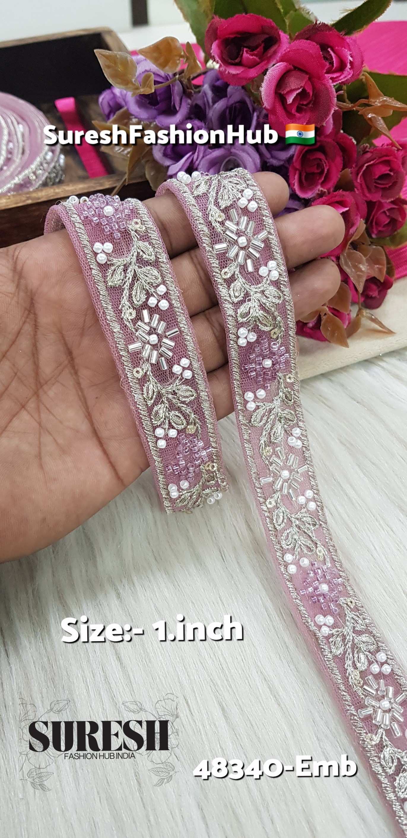 1 inch embroidery lace, tone-to-tone lace border, machine hand embroidery lace, cutdana pearl lace, designer lace trims wholesale, net embroidery lace, 48340-EMB lace, boutique lace suppliers India, premium lace for sarees, SF India lace, Suresh Fashion Hub lace.