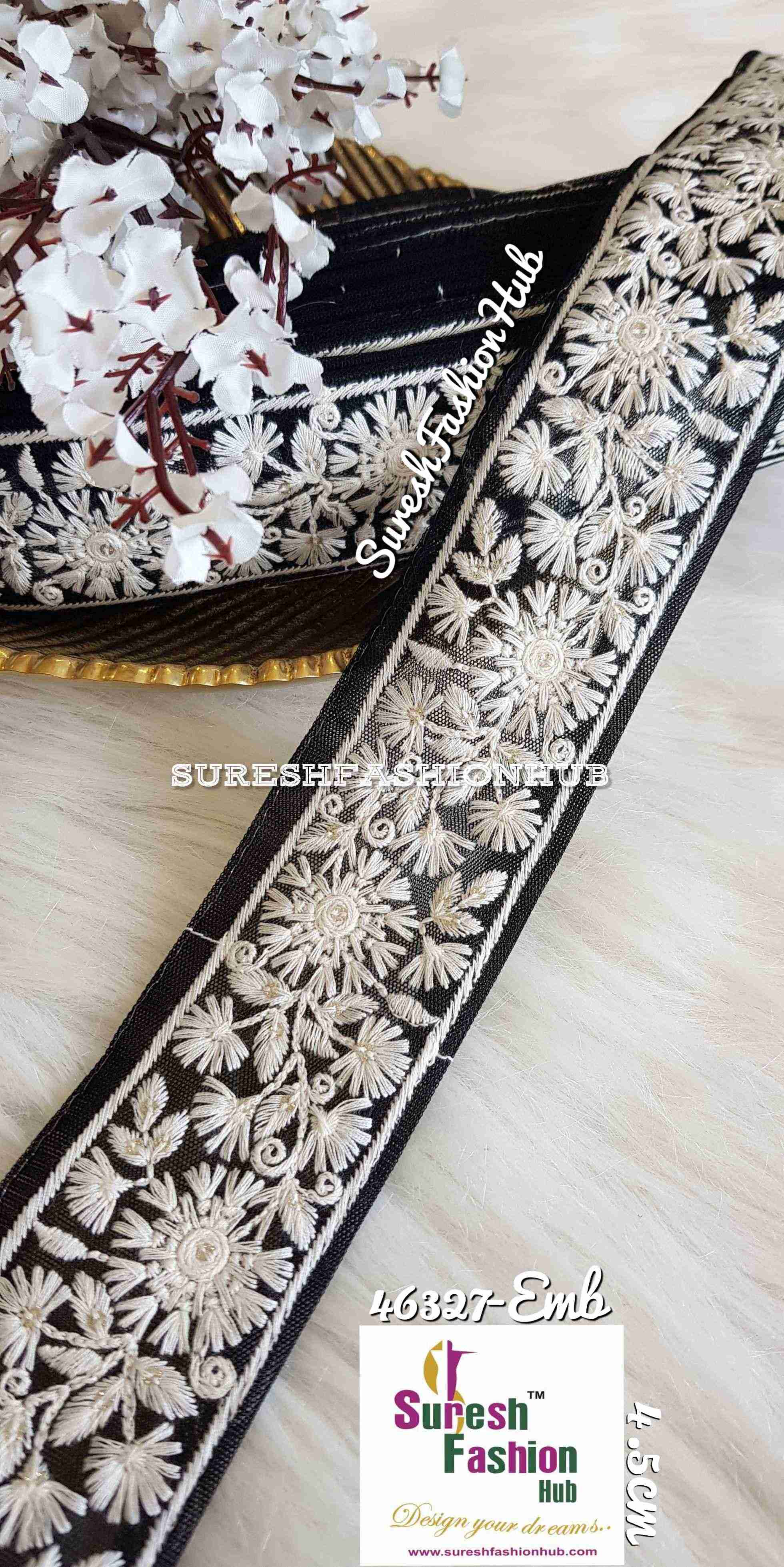 Intricate White Thread Work On Mesh Base With Delicate Black Color Designer Trim.Thread Embroidered Trims are Decorative Borders or Edges Made of Threads That Have Been Intricately Woven or Embroidered Onto a Fabric.These Trims Come in a Wide Variety of Designs, Patterns, and Colors, Making Them Highly Versatile and Suitable for a Range of Styles and Purposes. Happy Shopping.