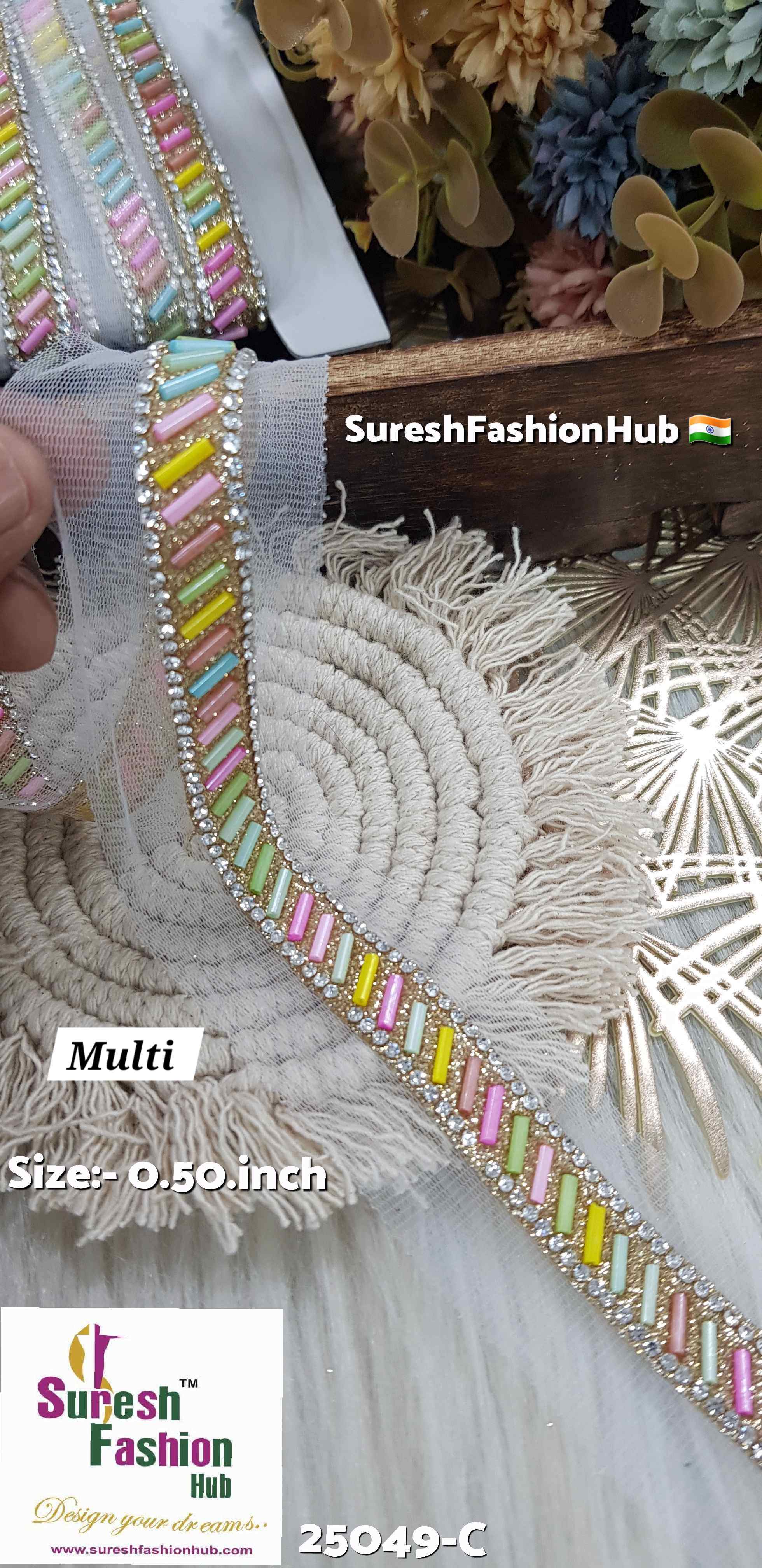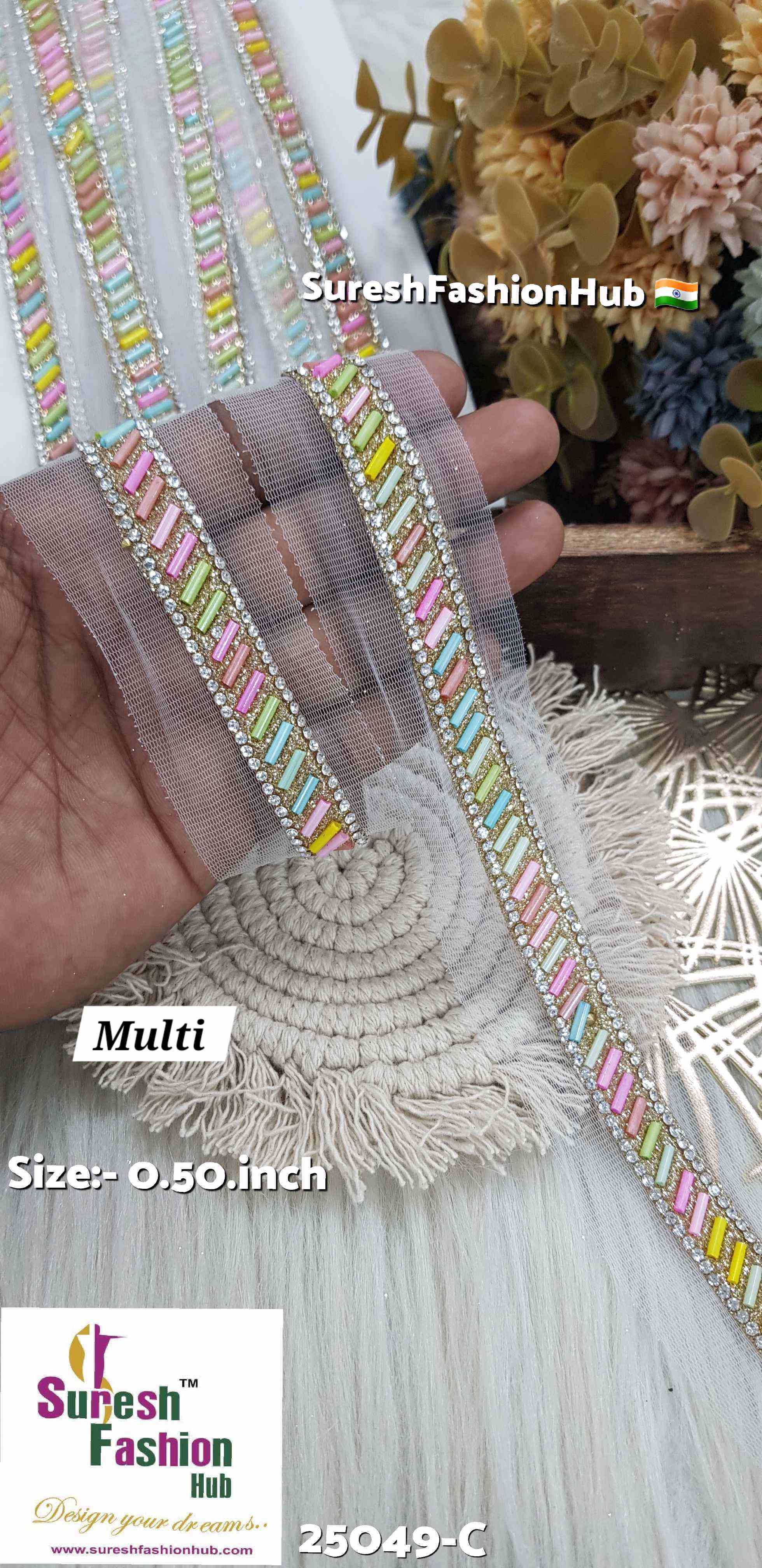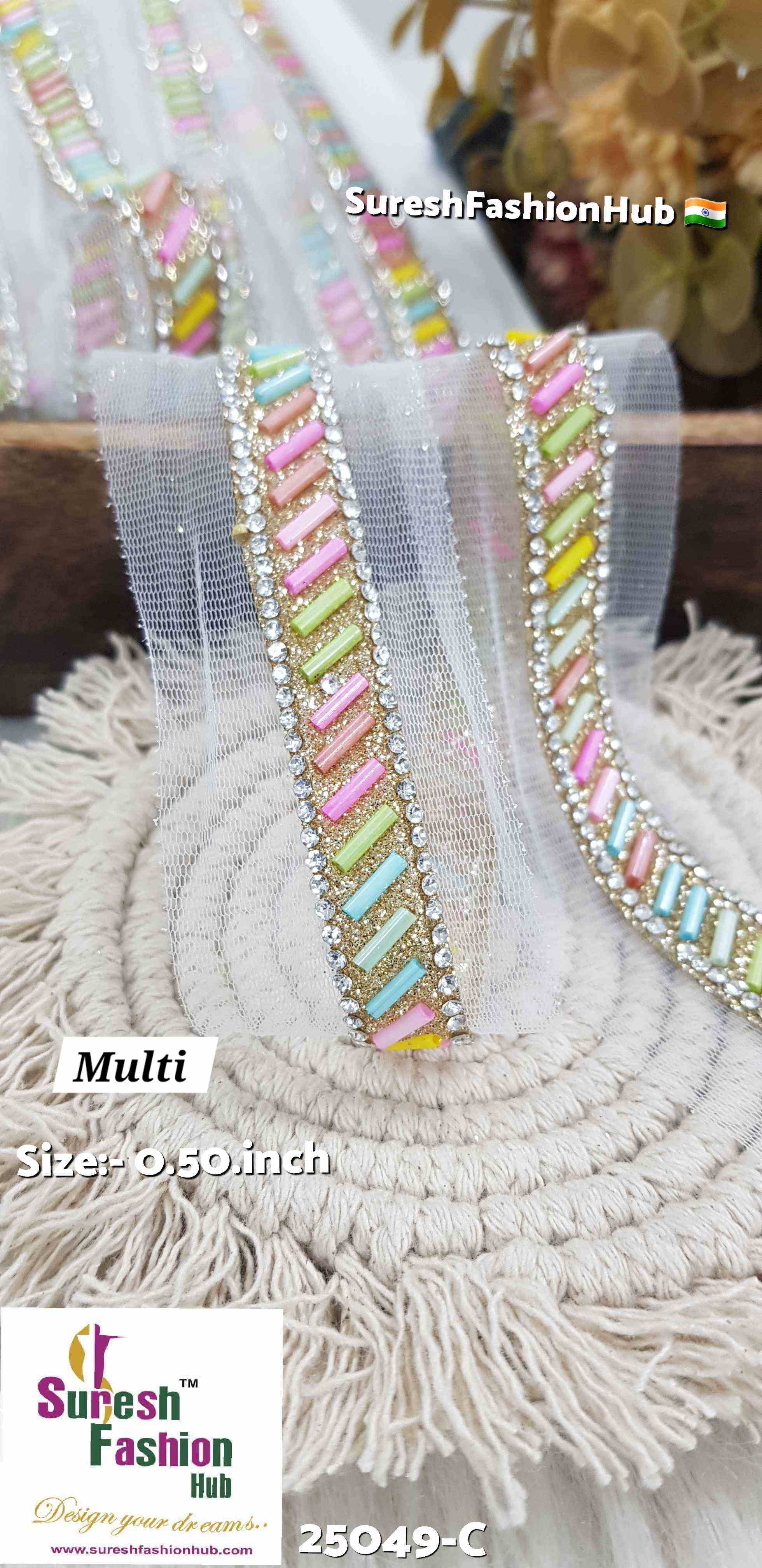 Introducing Rainbow Delight Borders, Design No: 25049-C. These vibrant borders, priced at Rs 725 for 9 meters, feature a dazzling array of multi-colorful Kaddhana with Diamonds from Jharkand. Perfect for adding a burst of color and sparkle to any creation, making it truly stand out.