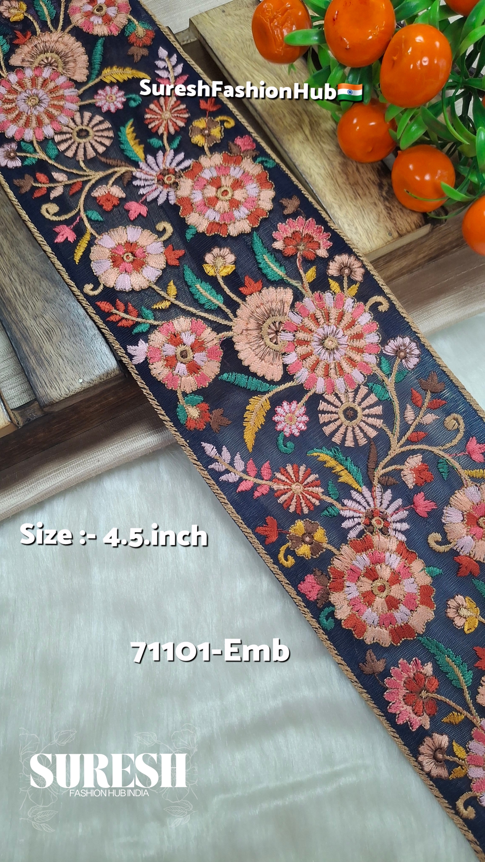 net embroidery lace border, floral embroidery lace, 4.5 inch embroidery lace, nine-needle thread work lace, designer net border, multi-color thread lace, boutique lace supplier India, Suresh Fashion Hub India lace, premium embroidery trims, fashion garment lace borders.