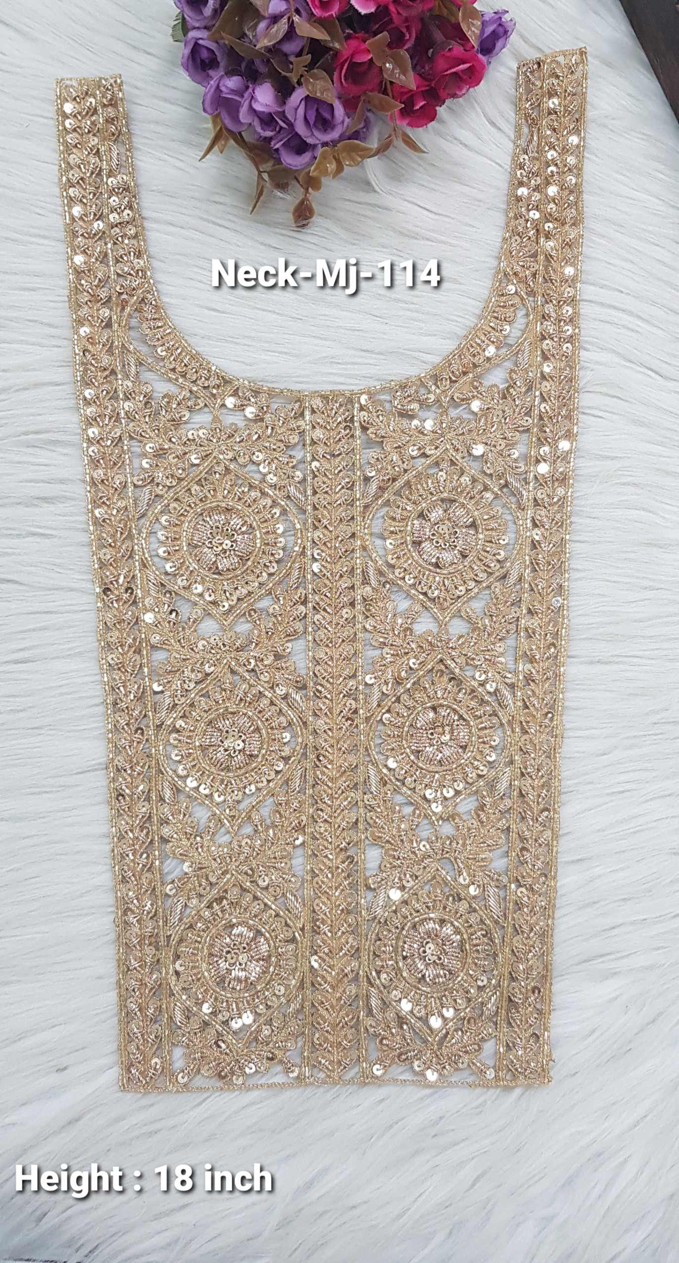 Introducing our Neck-Mj-114 Zardorsi Neck Design, an 18-inch handcrafted masterpiece that reflects the grandeur of royal embroidery. This elegant neck is paired with matching sleeve borders, offering a perfectly balanced and luxurious look for any traditional or bridal outfit.