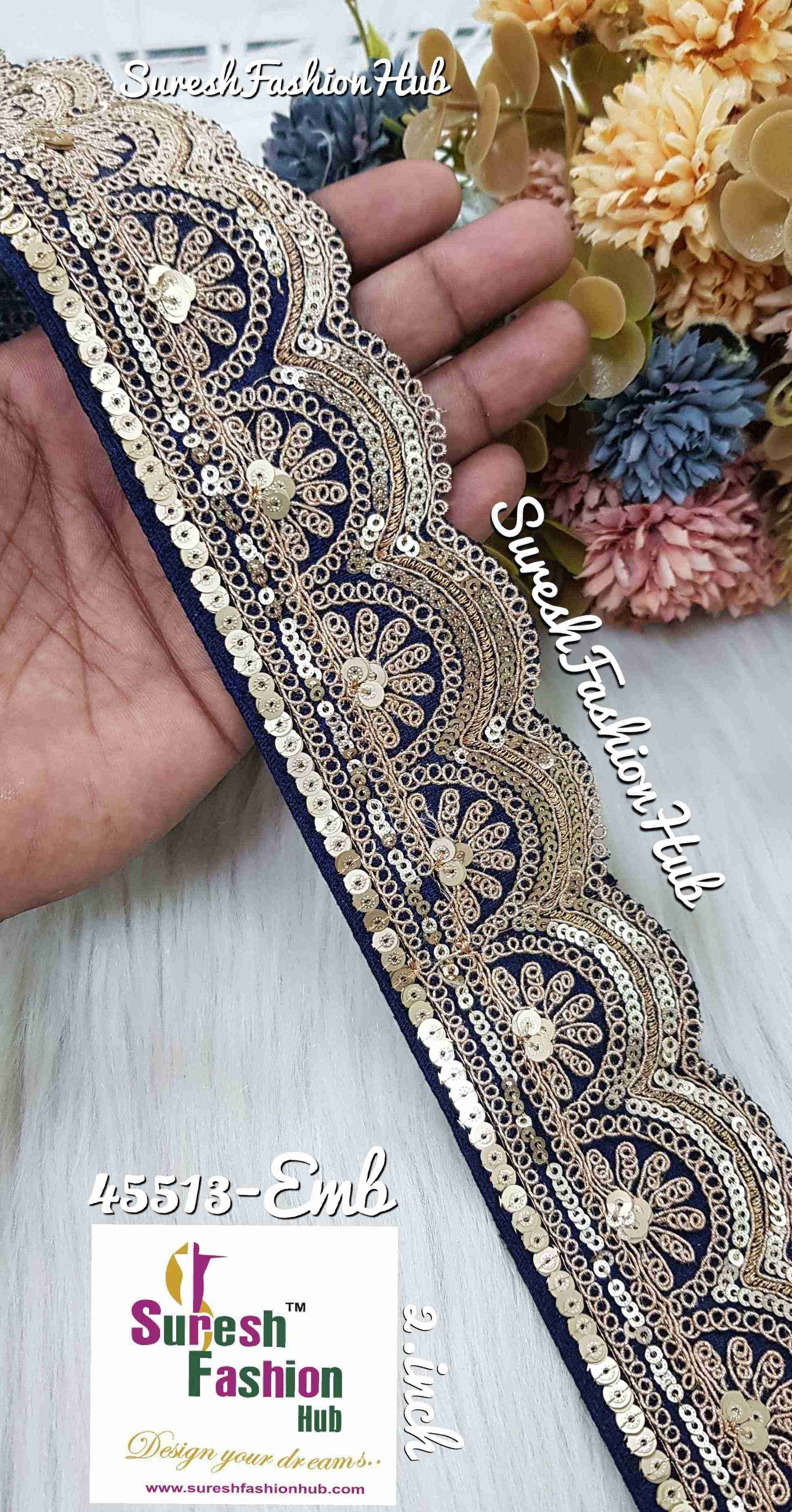 Introducing "Nevy Blue Elegance in Scallops Lace," a stunning design that effortlessly blends sophistication and richness. This lace is meticulously crafted with 5mm and 3mm sequence, showcasing an exquisite scallop pattern. The intricate dori work adds a touch of elegance, creating a lace that emanates a luxurious aura. Ideal for enhancing sarees, dupattas, and ethnic wear, this design promises to elevate your creations with its refined detailing. Discover the perfect harmony of style and opulence as each scallop unfolds to reveal a timeless beauty. Let your designs resonate with the regal charm of this lace.