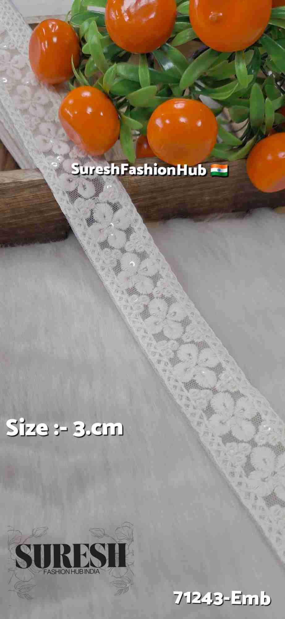 Design *71243-Emb* is a *delicate floral Lakhnavi border lace, beautifully crafted on a fine net base using **soft off-white threads* and gently highlighted with *transparent sequins* for a subtle, refined sparkle. The *3cm width* makes this lace ideal for fine detailing, soft edging, and elegant accents without adding visual heaviness.