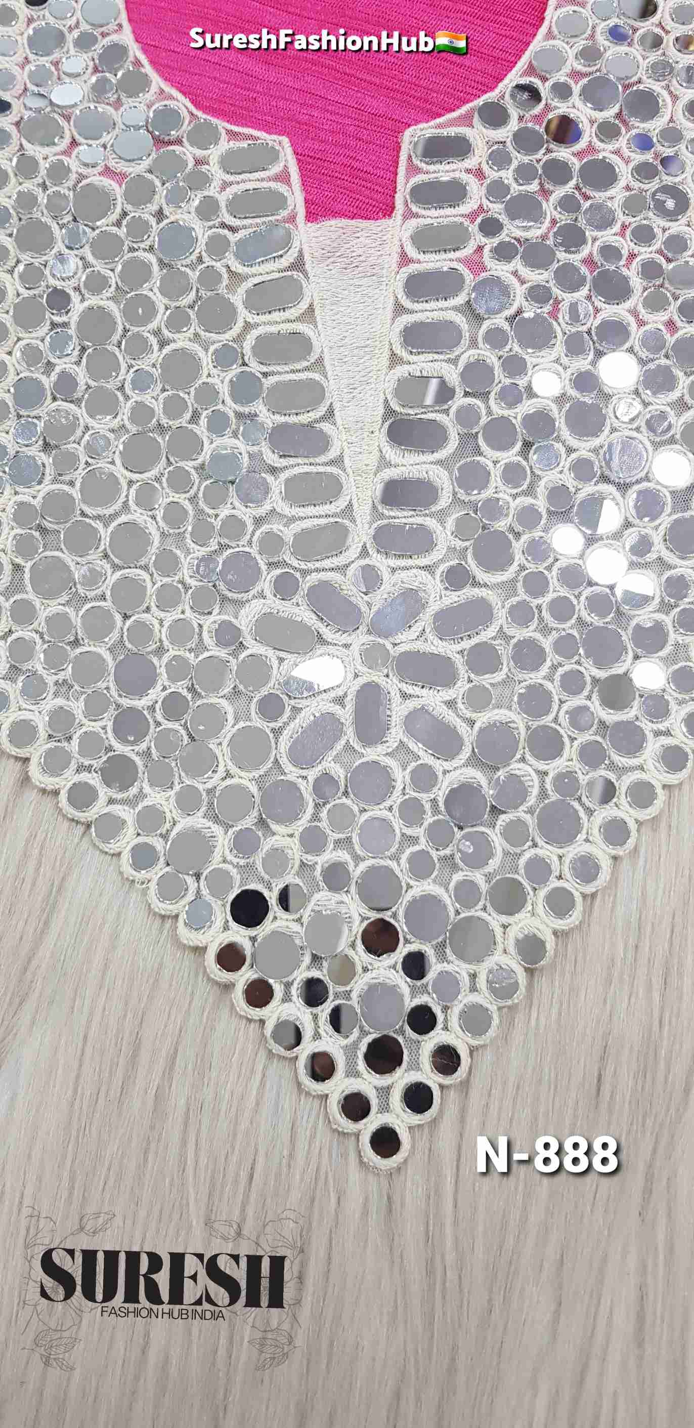Geometric floral mirror neck, N-888 embroidered neck patch, mirror work neck design on net, machine embroidery mirror neckline, geometric mirror neck India, designer neck patch wholesale.