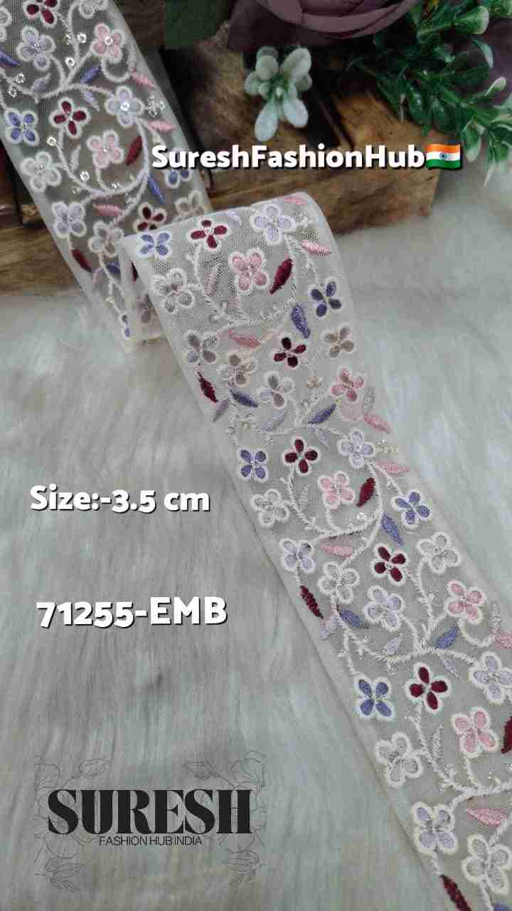 Design *71255-Emb* is a premium *multi-color thread floral embroidery lace* beautifully prepared on net fabric. This elegant design features detailed floral embroidery created using contrast matching threads to enhance the richness of the base net color.