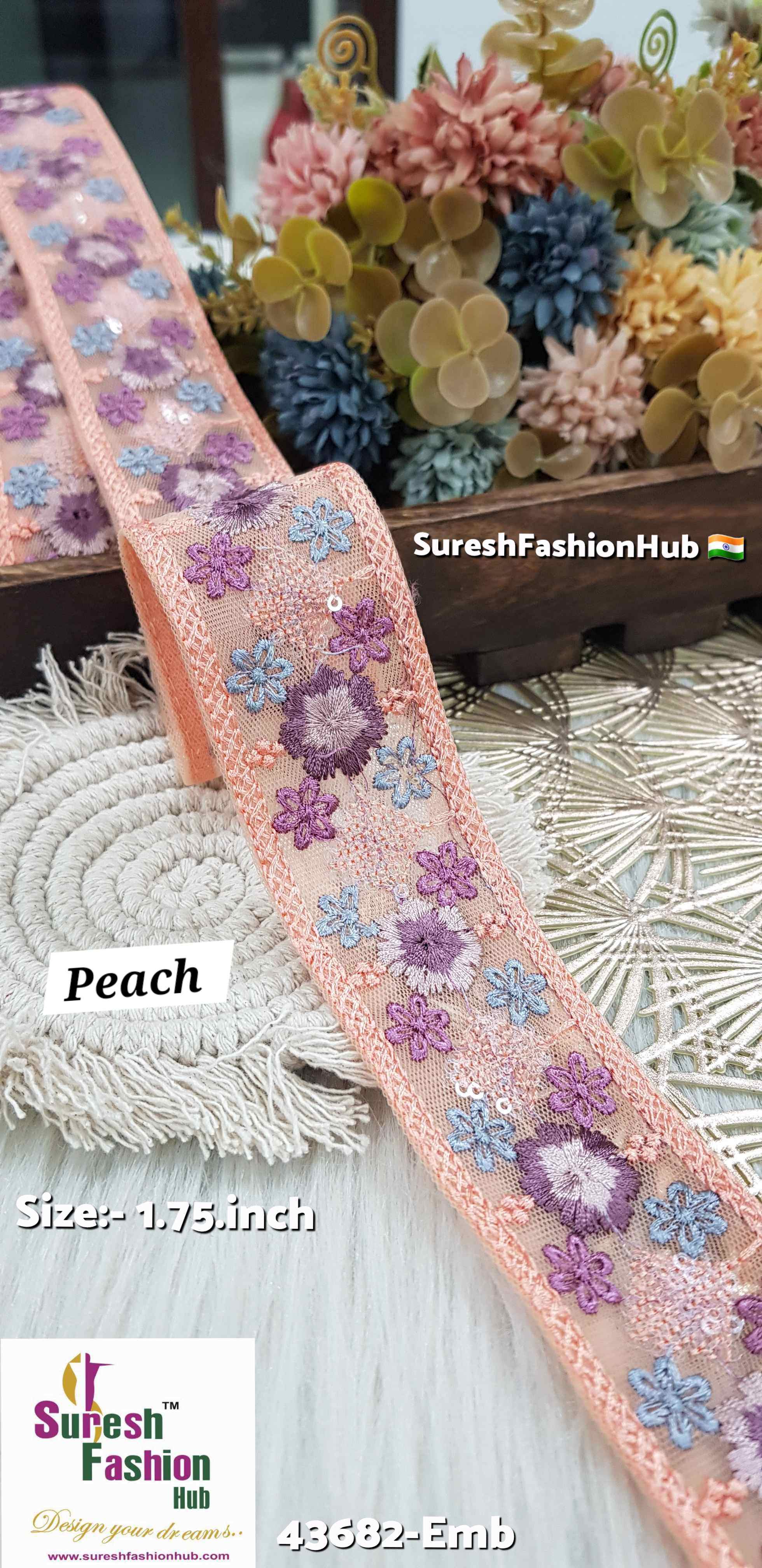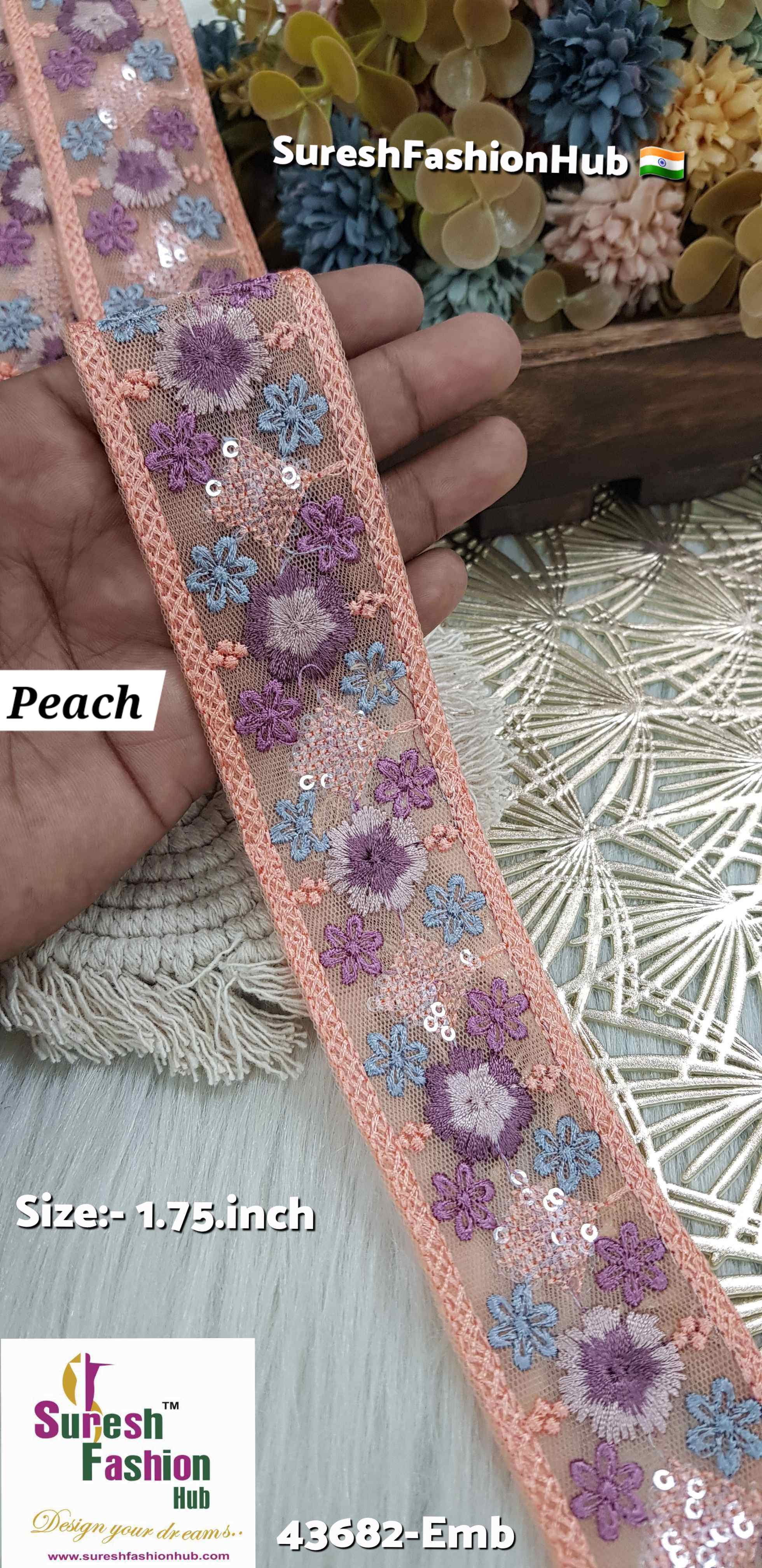 Introducing our exquisite floral embroidery lace, Design No: 43682-Emb. This 1.5 inch wide border is priced at Rs 650 for a roll of 9 meters and is available in six stunning base colors: Light Wine, SeaGreen, Moff, Peach, BabyPink, and Grey. Crafted on net fabric, this design features a captivating mix of big and small flowers adorned with transparent sequins that seamlessly blend with the net's color, creating a harmonious and elegant look. Perfect for adding a touch of sophistication and beauty to any garment or accessory.