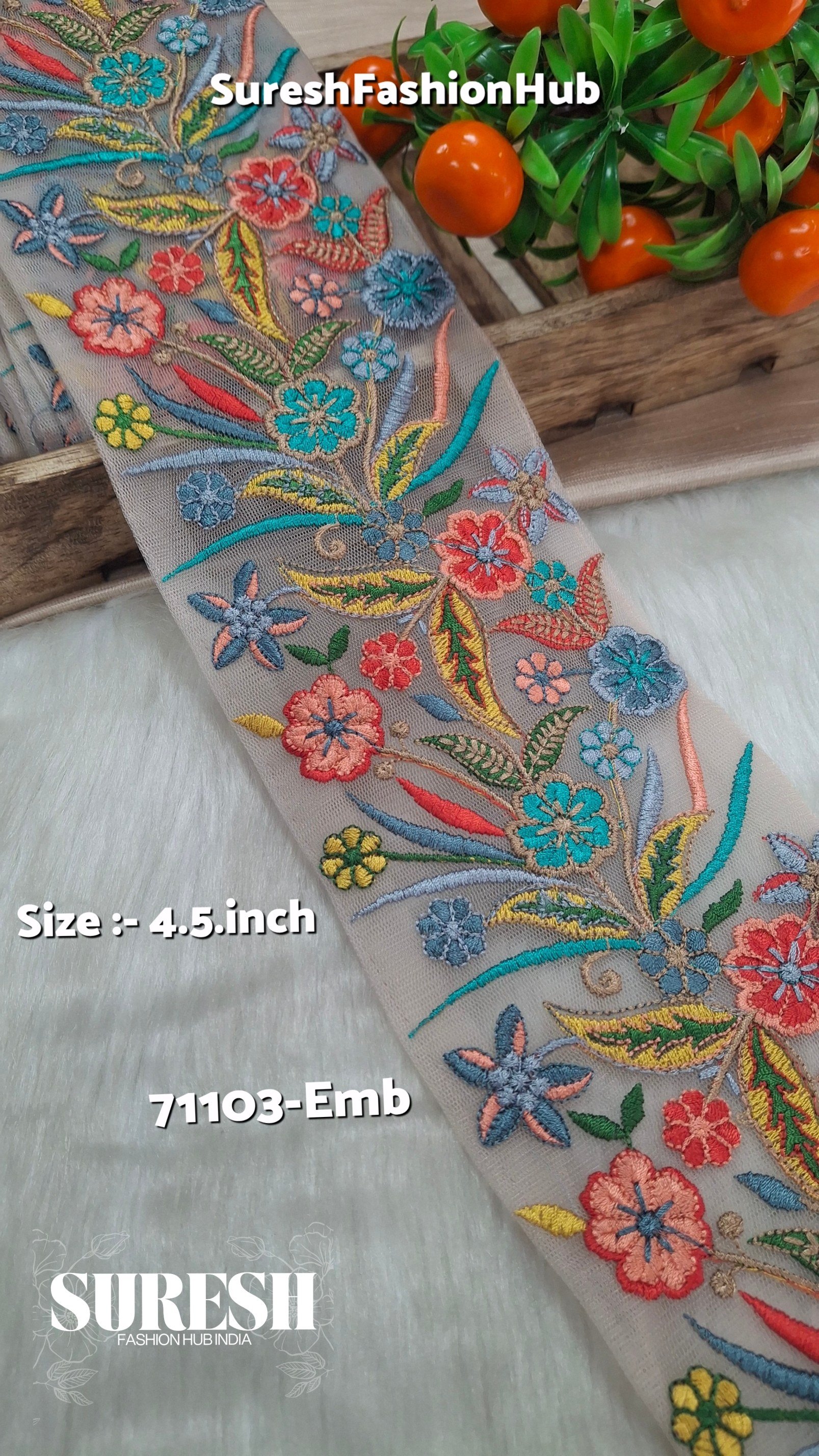 Introducing our *Exquisite Multi-Color Embroidery Net Border*, a premium 4.5-inch design crafted to perfection for designer and boutique wear.