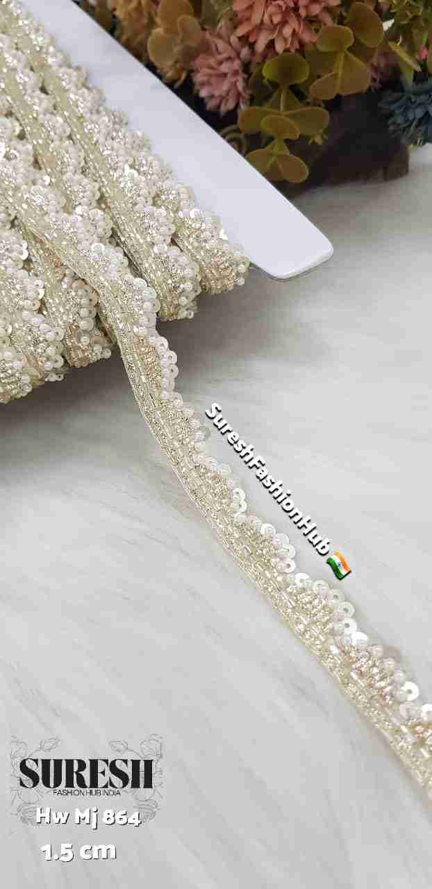 Design *Mj-864* is a *graceful Pearl-toned scalloped border lace, beautifully handcrafted on a premium fabric base to deliver a **soft, refined, and luxurious finish. The one-side scalloped edge is delicately shaped using **fine zari detailing, while the surface is enriched with a harmonious blend of **shimmering sequins, elegant pearls, intricate nakshi, and sparkling cutdana*, creating a balanced sparkle that feels both subtle and couture-inspired.