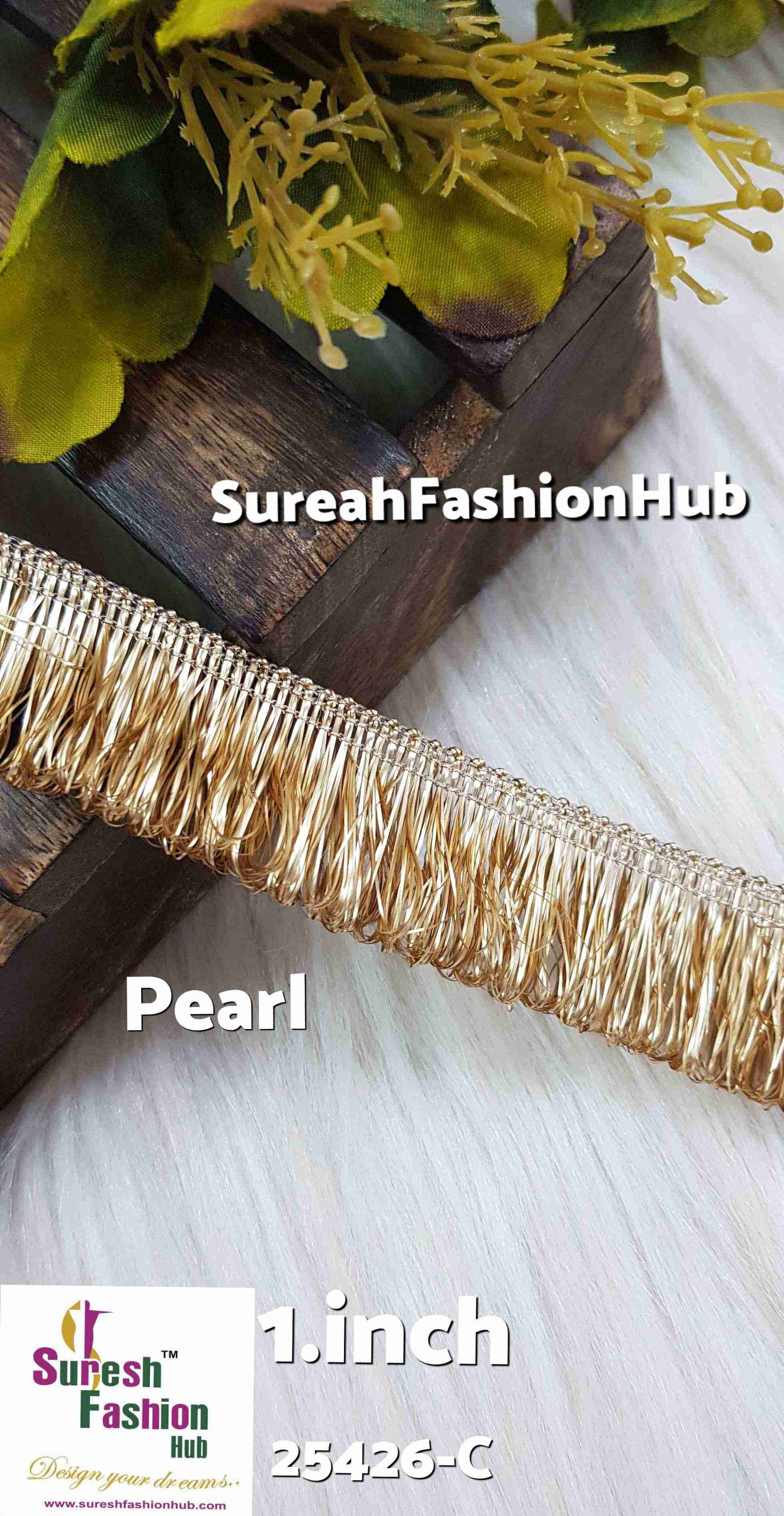Elevate your creations with the exquisite charm of our Pearl-Gold Badla Fringe Lace! This 9-meter lace is a masterpiece of sophistication, featuring delicate fringe detailing in a lustrous pearl-gold shade. Perfect for adding a touch of elegance to garments, accessories, and decor, this lace exudes timeless beauty. With a width of 1 inch, it offers versatility for various applications. Priced at an affordable Rs 105 for 9 meters, this lace is a must-have for every sewing enthusiast. Enhance your designs with the opulent allure of our Pearl-Gold Badla Fringe Lace today!