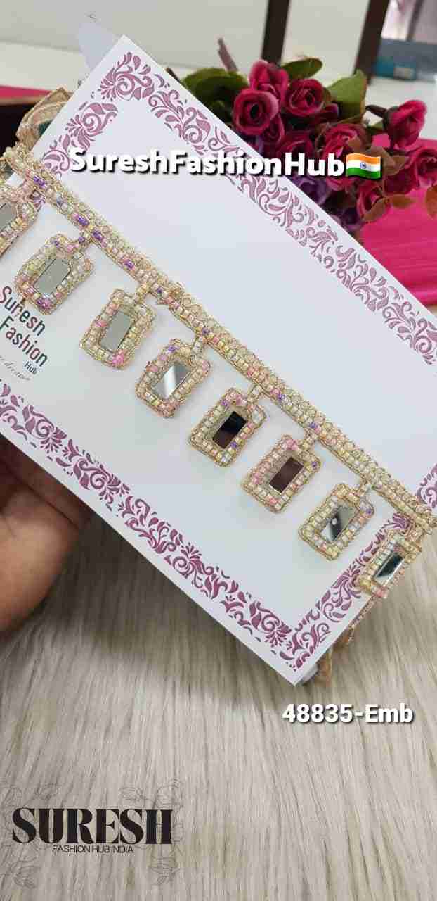 The highlight of this lace is its *rectangular mirror embellishments, carefully placed to reflect light and create a stunning visual sparkle. The mirrors, combined with the beadwork, form a **graceful hanging effect* along the border, giving the lace a premium, flowy finish that looks especially beautiful on sarees, lehengas, dupattas, and festive garments.