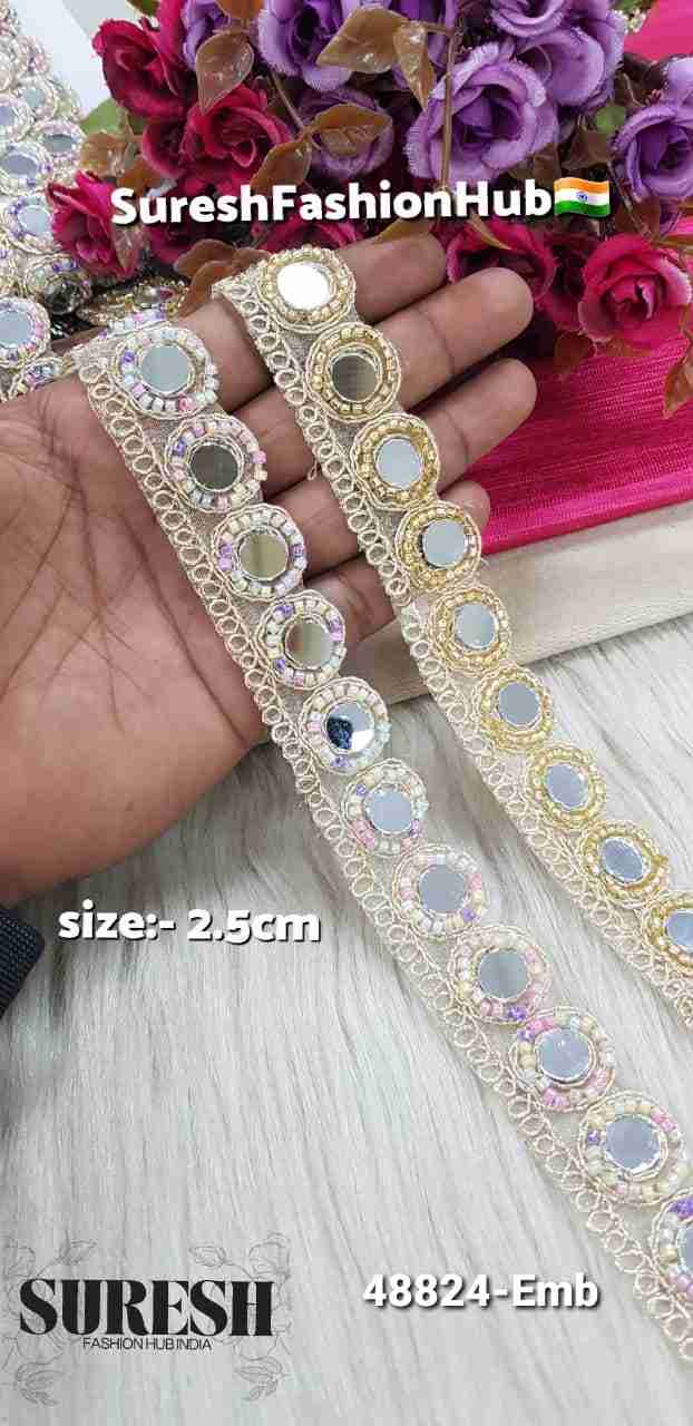 Introducing our *Scallop Round Mirror Cutdhana Border Lace, a beautifully detailed decorative trim designed to add refined sparkle and handcrafted elegance to premium ethnic and festive fashion. This stunning one-side lace features a **soft scalloped edge enhanced with fine cutdhana beadwork*, creating a rich texture that feels delicate yet luxurious.