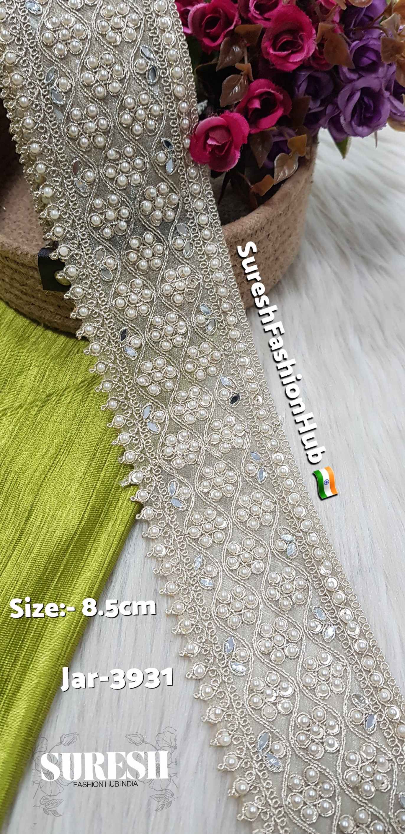 Pearl lace border, mirror moti lace, Jar-3931 lace, dori sequence lace India, designer mirror lace, pearl embroidery lace, premium ethnic lace.