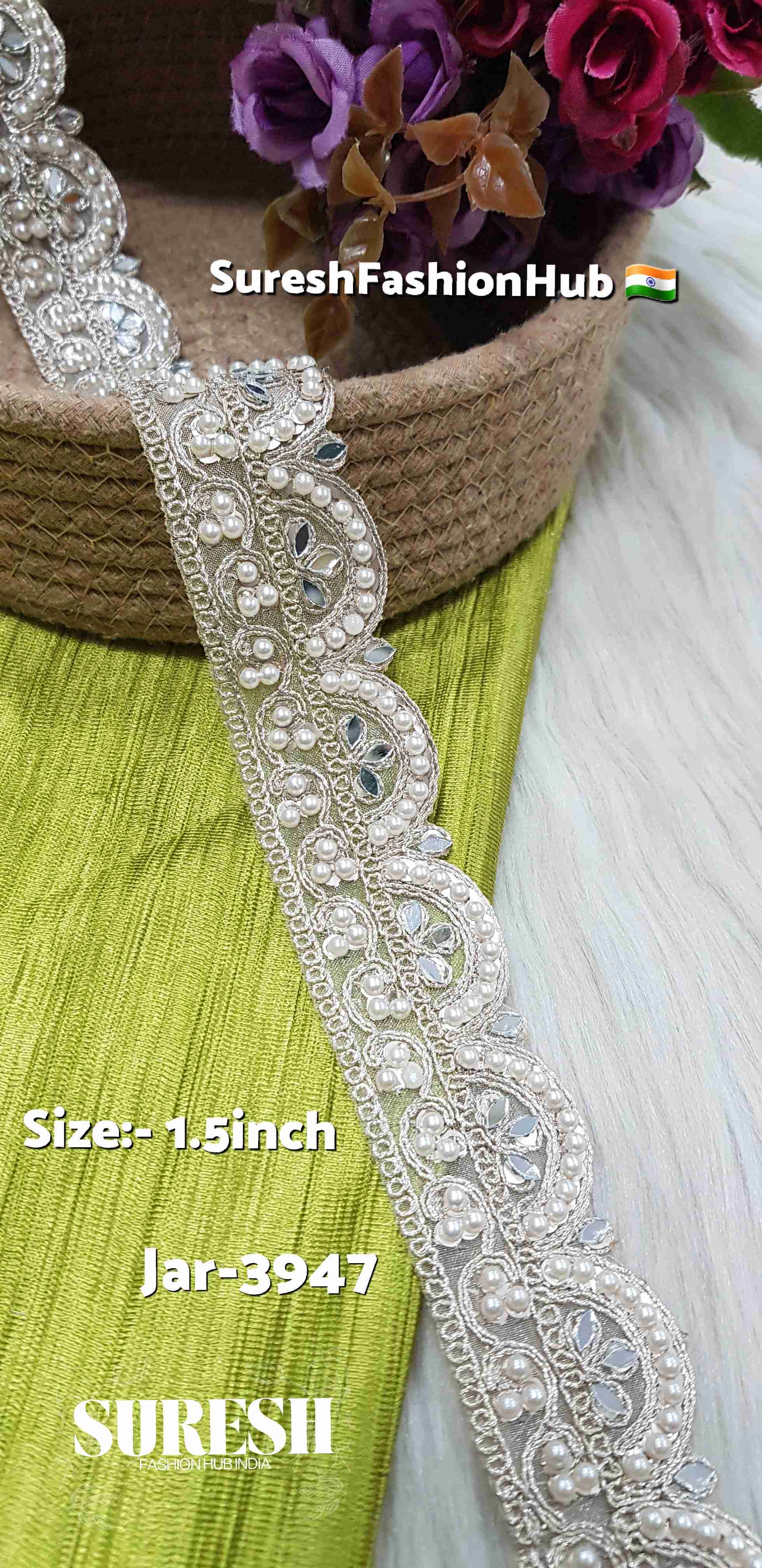 Pearl lace border, mirror moti lace, Jar-3947 lace, dori sequence lace India, designer mirror lace, pearl embroidery lace, premium ethnic lace.