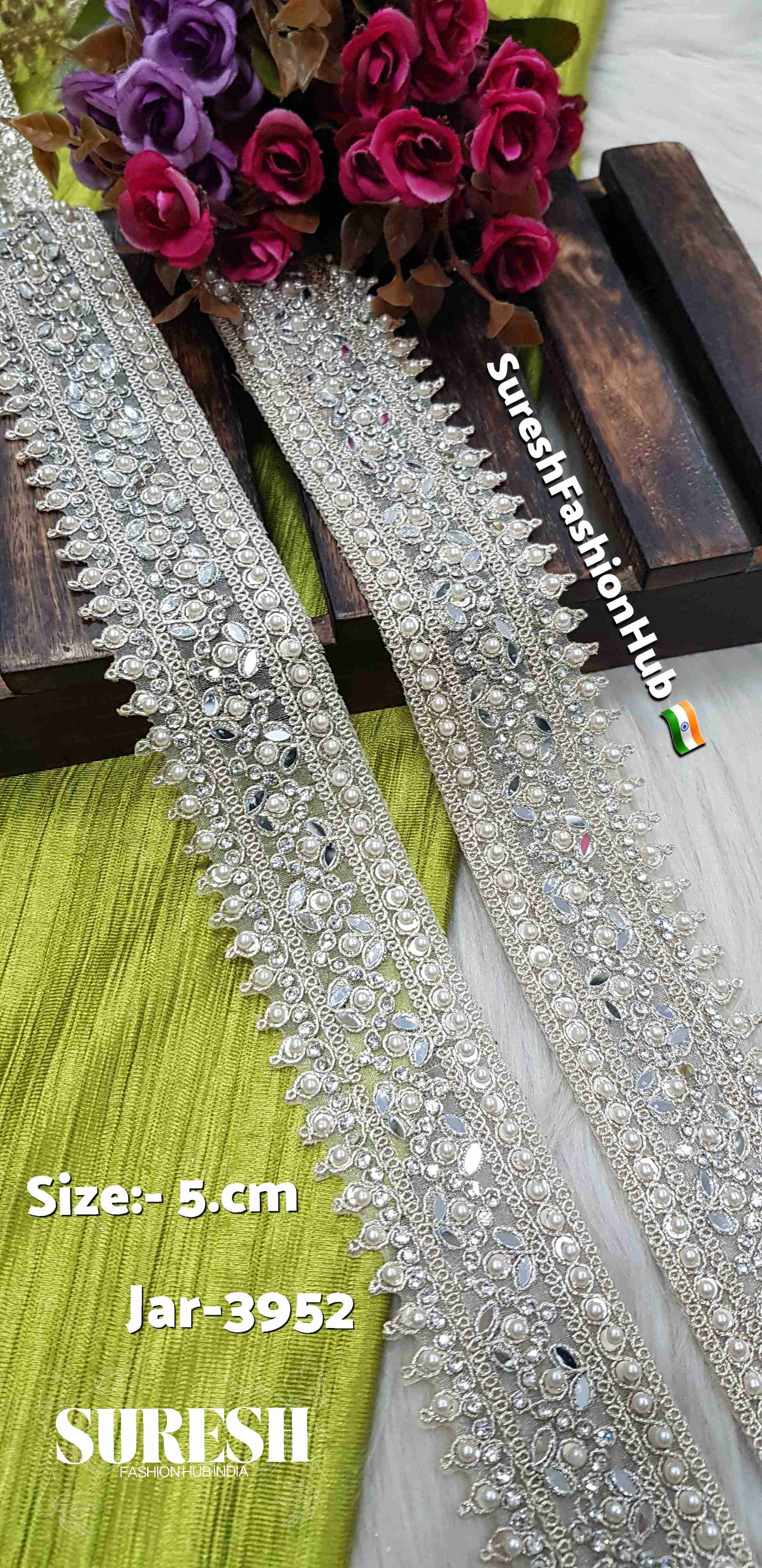Presenting our *Jar-3952 Pearl Shade Mirror, Moti & Diamond Dori Lace, a **beautifully crafted and luxurious lace design* created to add elegance and sparkle to premium garments.