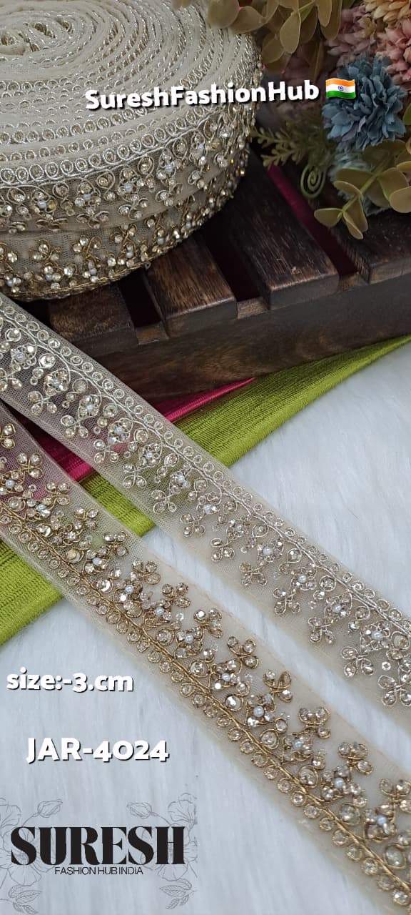 Introducing our *Dori Net Rhinestone Lace, a beautifully crafted designer border that blends delicate structure with elegant shine. This lace is prepared using detailed **machine dori work on net fabric*, giving it a light yet refined appearance.