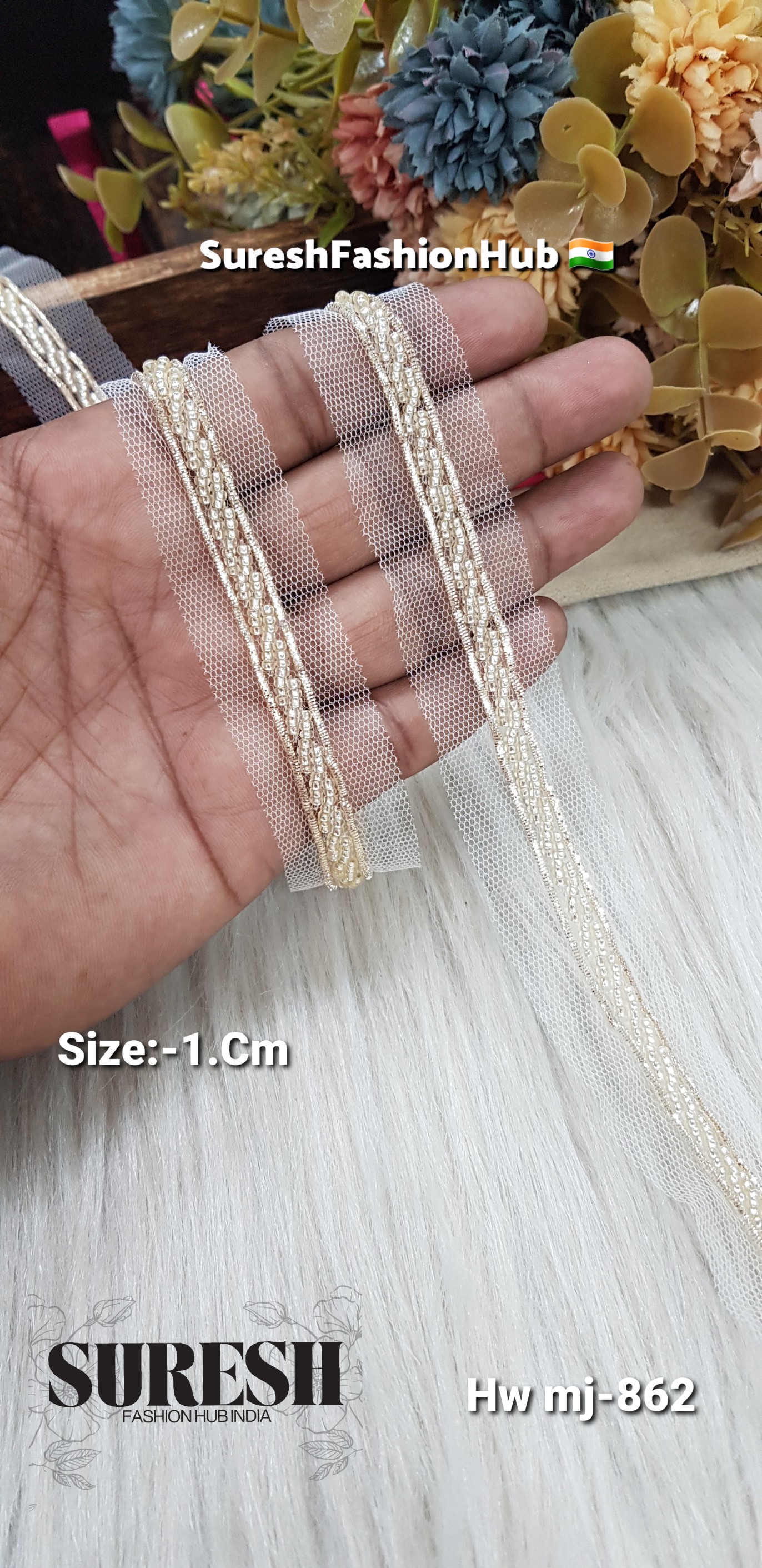 Introducing our *Mj-862 Handmade Pearl Border, a **1 cm ultra-delicate handcrafted lace, priced at **Rs 1100 for 9 meters*.