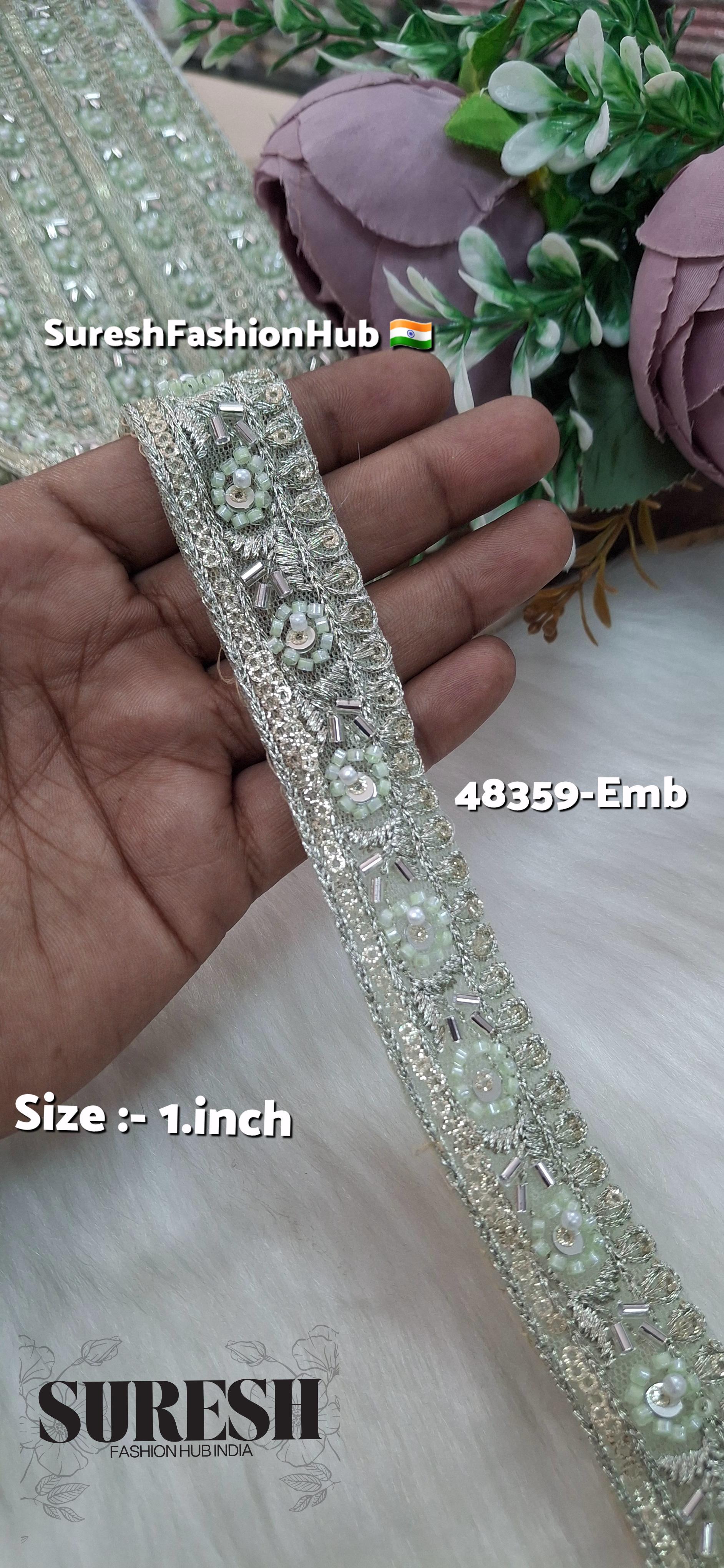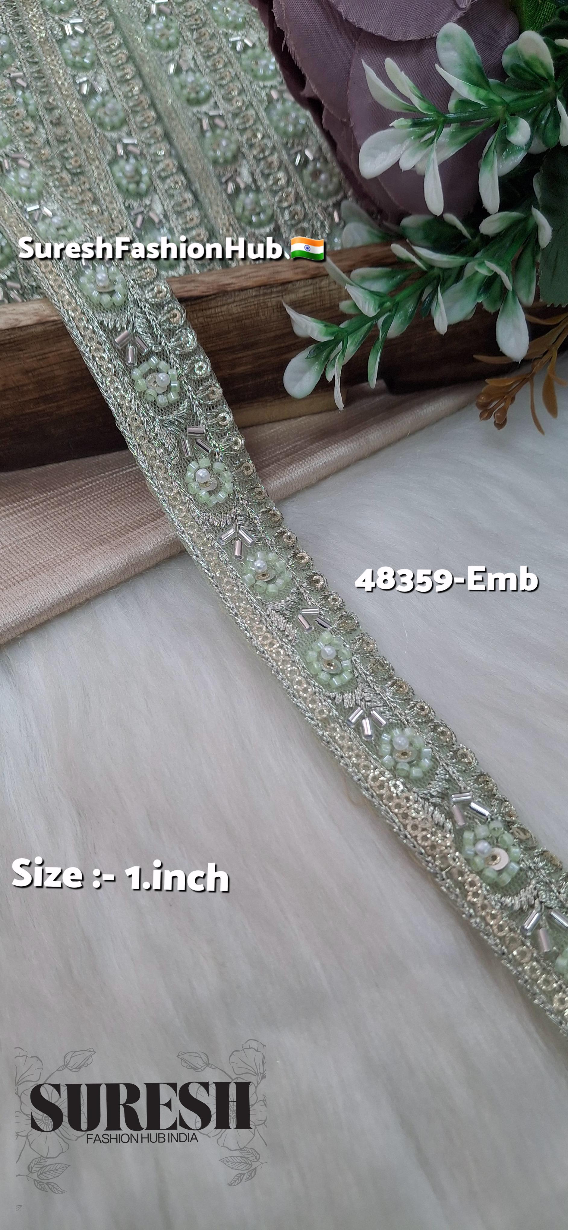 *Design Number: 48359-Emb, a stunning **1-inch embroidered lace* that combines intricate craftsmanship with delicate aesthetics. Designed on premium net fabric, this lace features a *machine-hand floral embroidery* finish that replicates the finesse of hand embroidery while maintaining precision and uniformity.