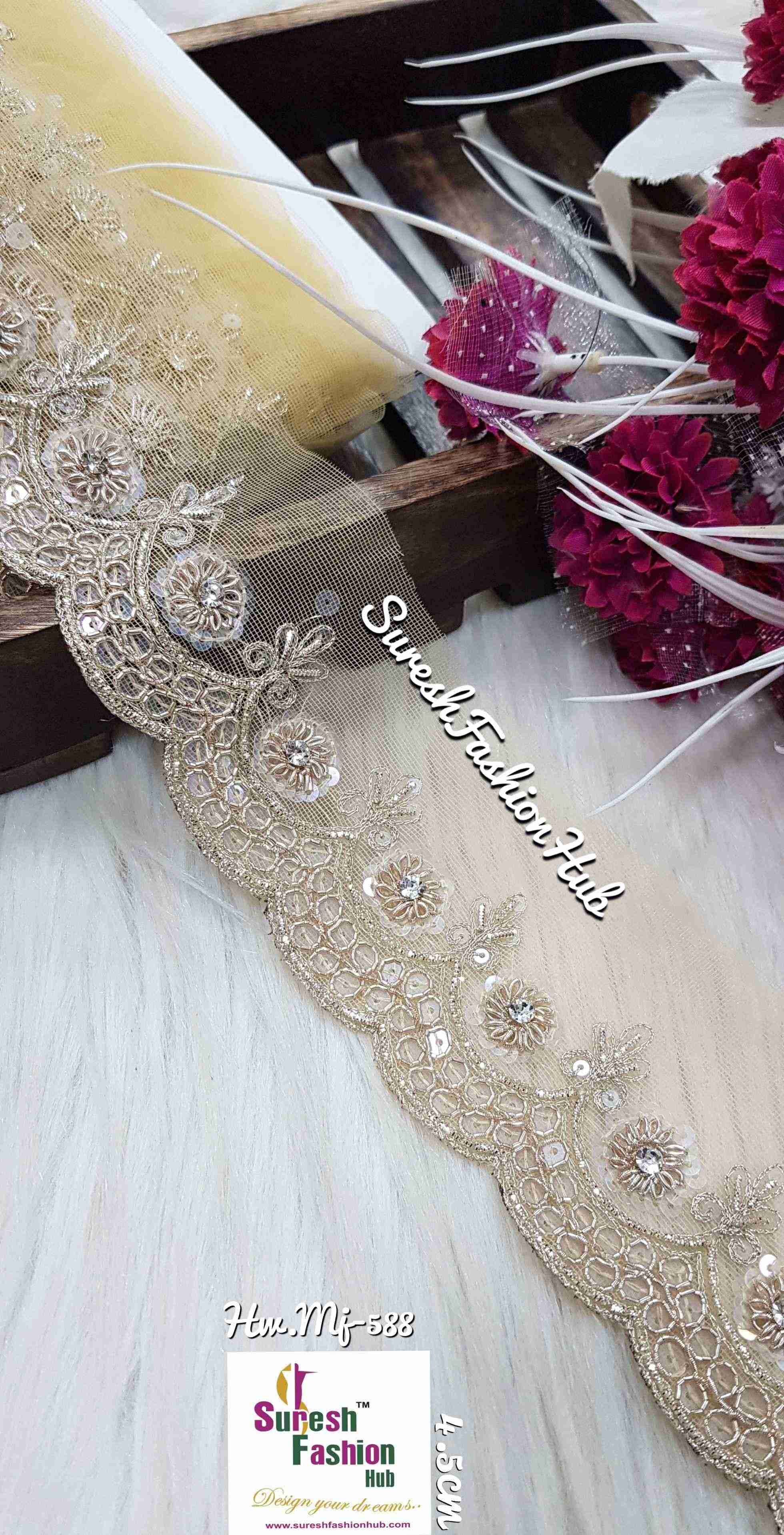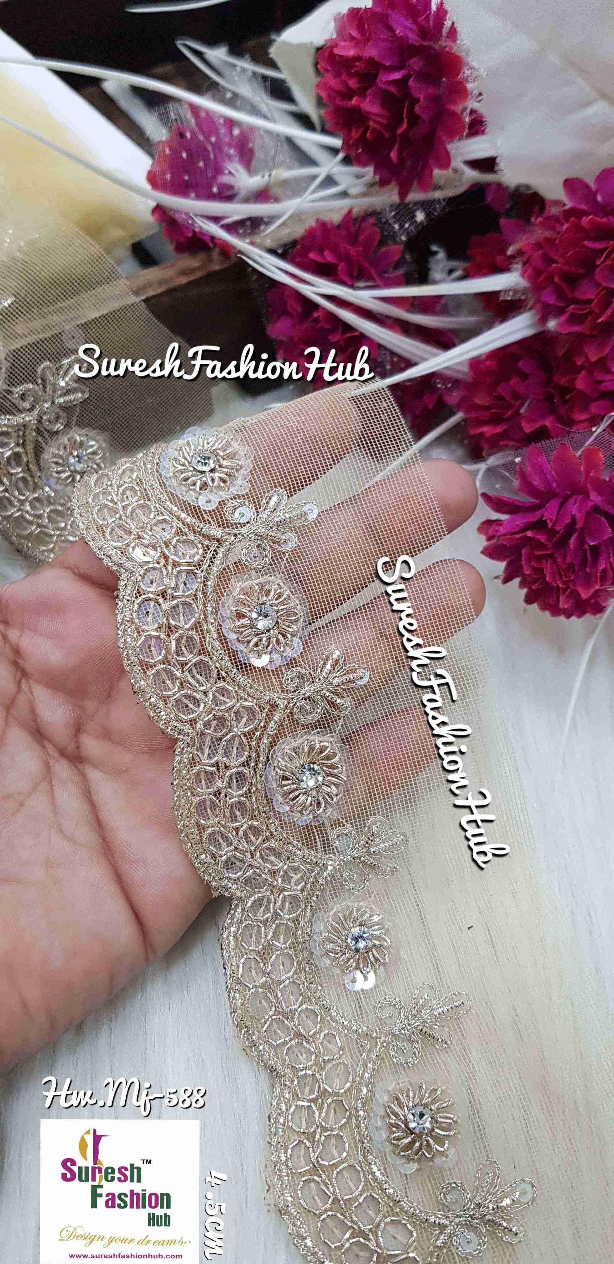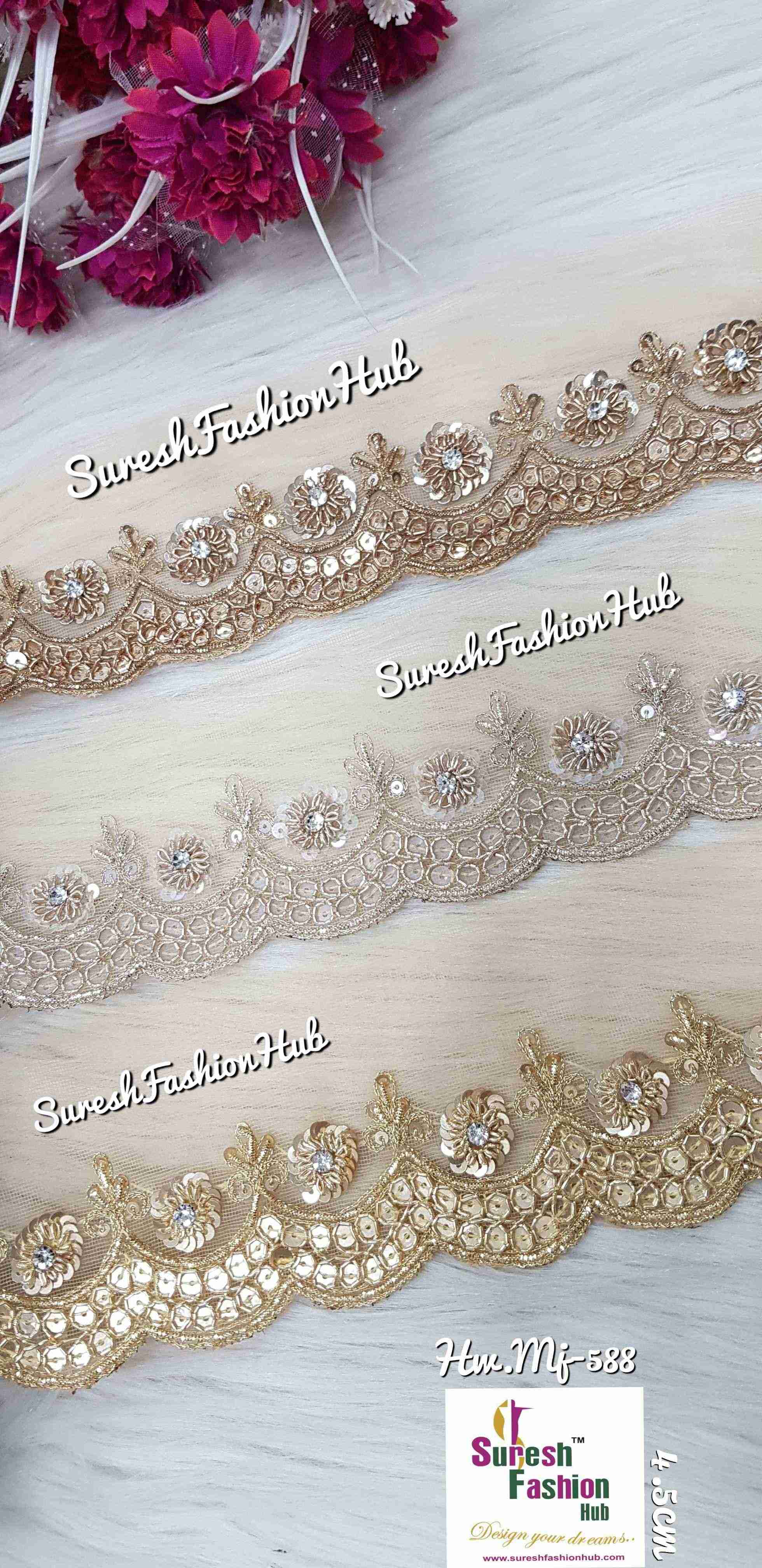 Introducing our "Radiant Net Elegance Lace," a dazzling creation available in three exquisite colors: Gold, Matt, and Pearl. The lace features a meticulously crafted sequence and zardosi border with a graceful one-sided scalloped design on net. Ideal for enhancing the borders of sarees, dupattas, and ethnic ensembles, this lace adds a touch of opulence and sophistication to your creations. Elevate your designs with the radiant charm of this net lace, where the interplay of colors and intricate detailing creates a statement of timeless elegance. Choose the color that resonates with your vision and infuse your creations with sheer glamour and style.