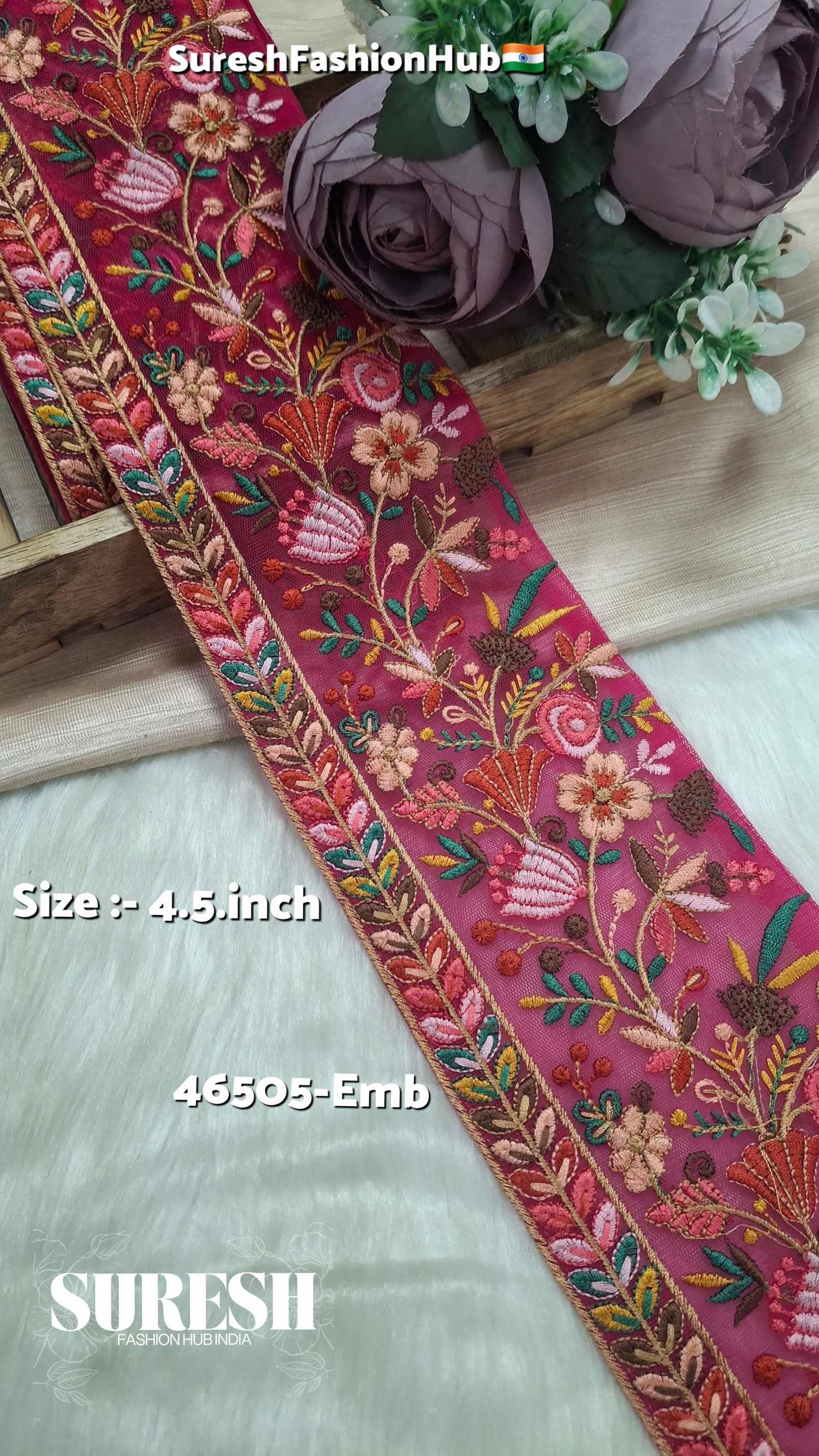 4.5 inch embroidery lace, net floral border, multi-color thread lace, designer embroidery lace India, nine-needle embroidery lace, premium net lace border, boutique embroidery borders, Suresh Fashion Hub India lace, floral net embroidery border, fashion garment lace trims.