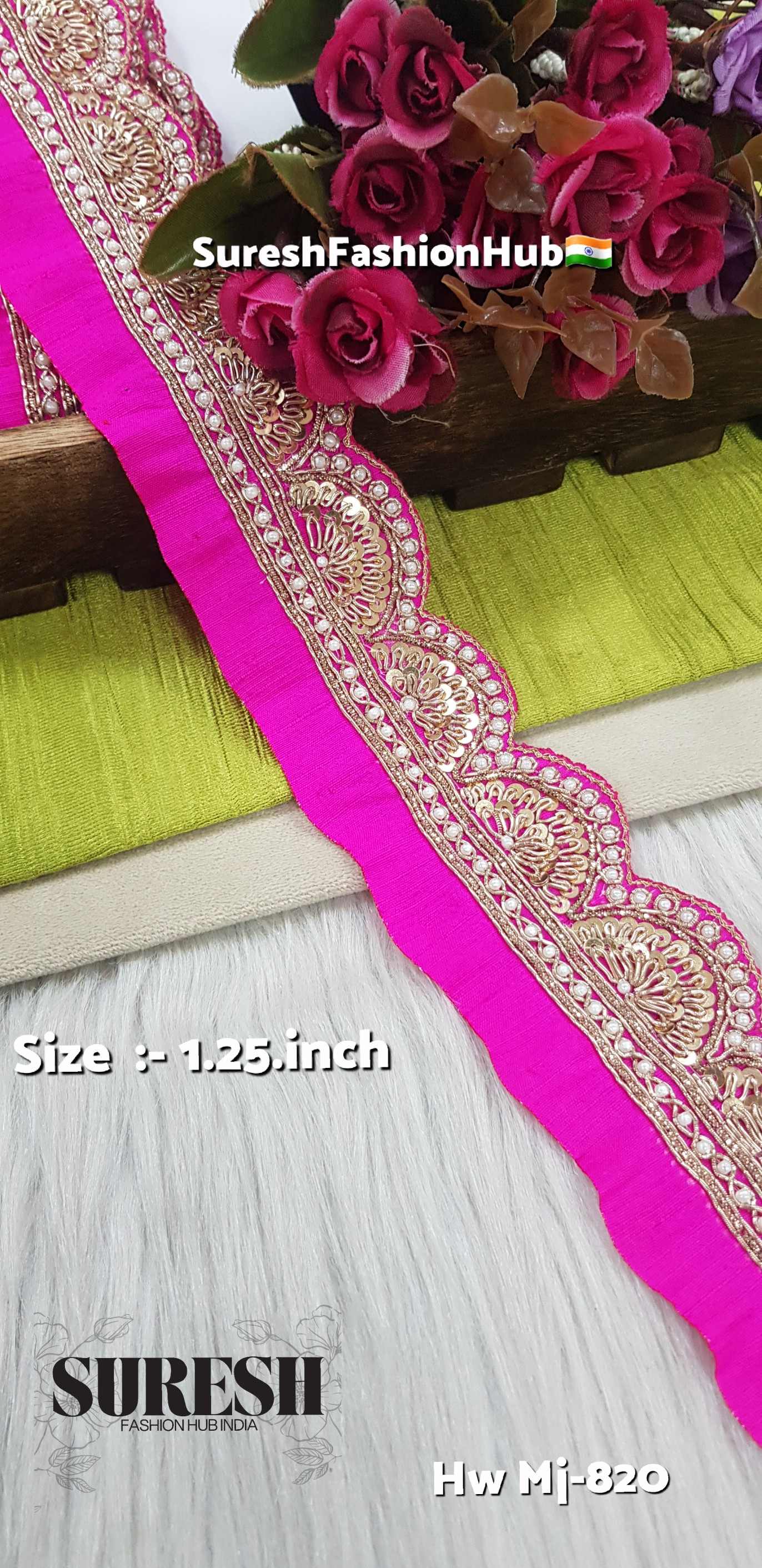 Introducing *Mj-820, a premium **pure handmade one-side scalloped zardosi border* crafted on fabric. This elegant lace is designed using *saadi, moti, sequence, zari, and nakshi*, giving it a rich and luxurious designer finish.