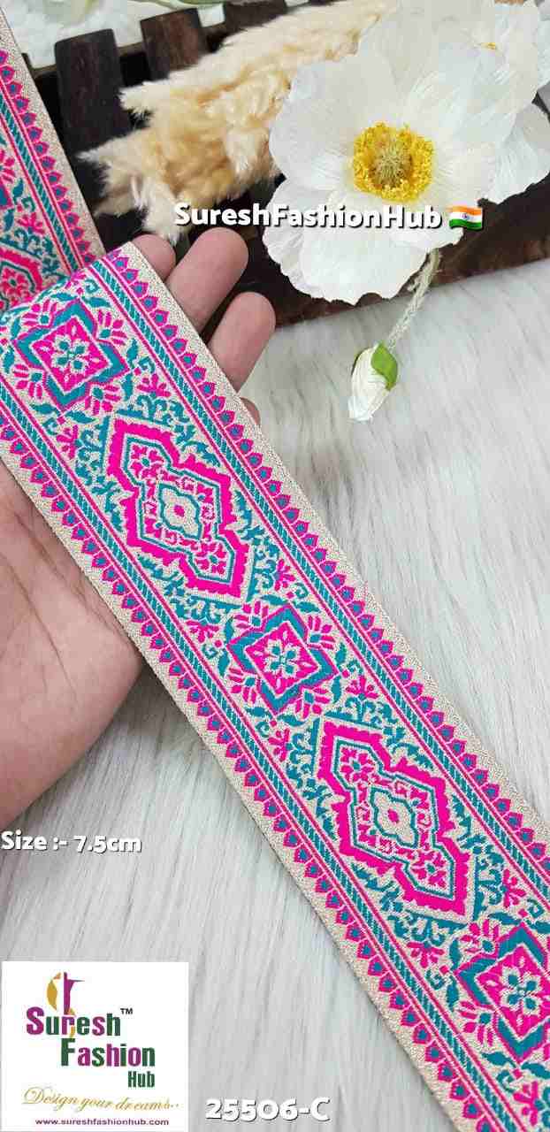 Introducing the *Heritage Grace Banarasi Floral Trim - 25506-C* from Suresh Fashion Hub India, a stunning Banarasi lace that showcases the beauty of traditional stamp designs combined with exquisite floral patterns. This lace is meticulously crafted to reflect the rich heritage of Banarasi artistry, featuring intricate designs that are both timeless and elegant. Made in our factory using high-quality materials and advanced machinery, this lace offers a flawless finish and a luxurious look. Available in a variety of vibrant color combinations, it is perfect for adding a touch of sophistication and traditional charm to any project.