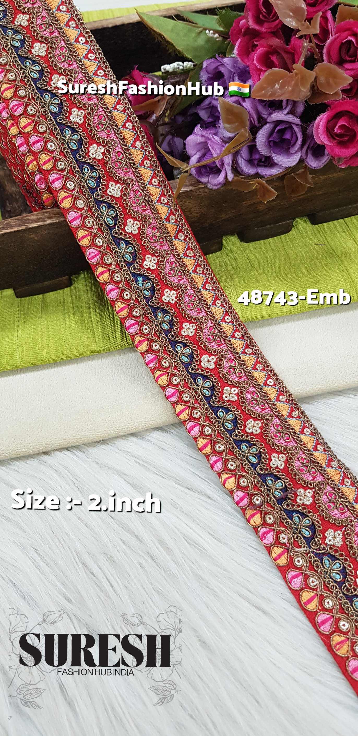 Presenting our *48743-Emb Sabyasachi Inspired Premium Embroidery Lace, a stunning 2-inch designer border crafted to elevate any ethnic or couture garment. Priced at **Rs 1300 for 9 meters, this lace has been developed in **nine rich fabric colors*, giving customers a wide choice to match their outfits perfectly.
