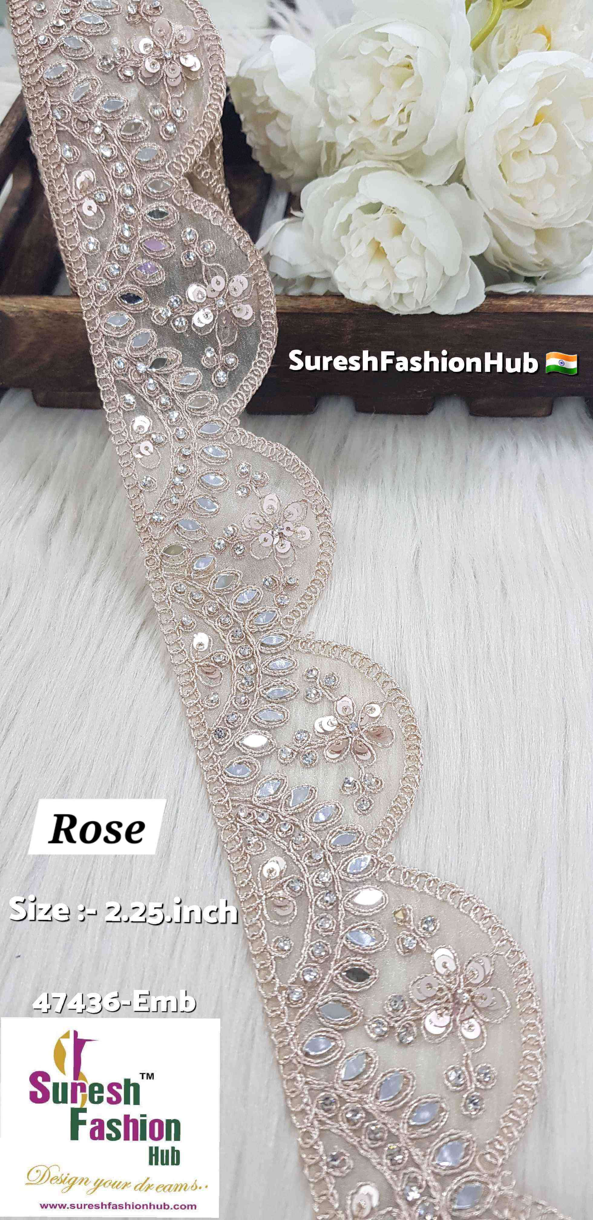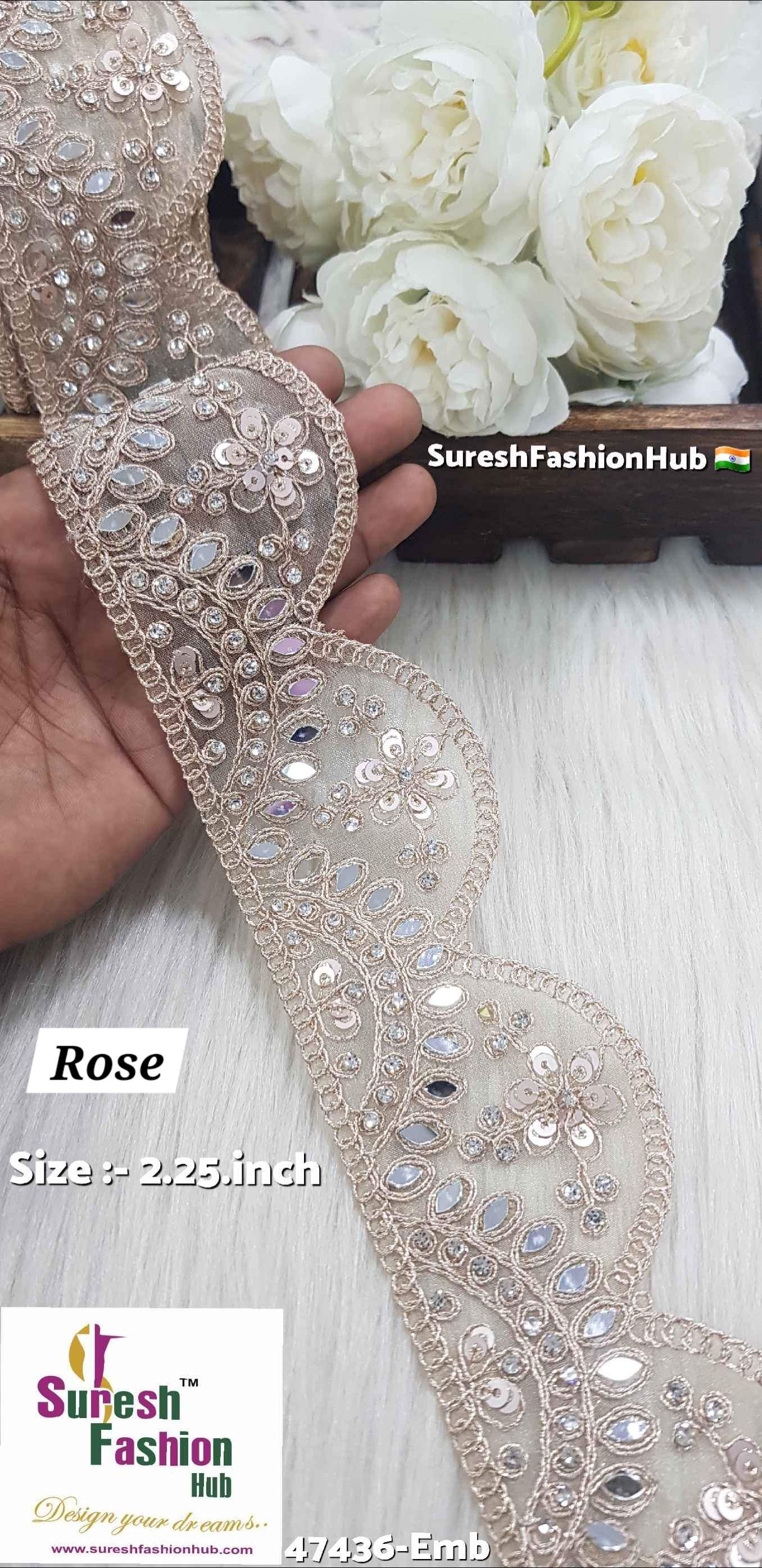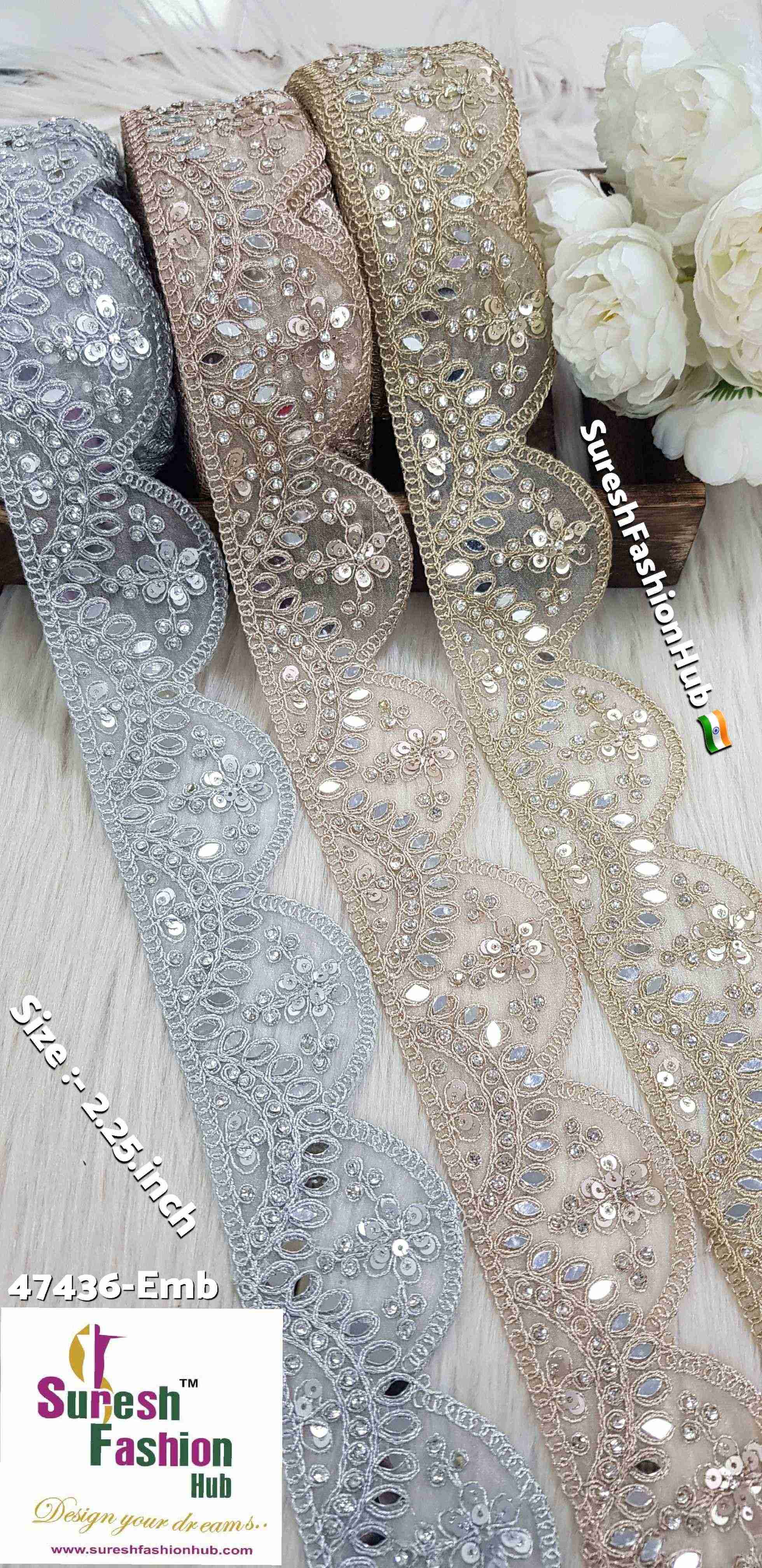 The 47436-Emb one-side scallop lace seamlessly combines mirrors, golden jari dori, and jarkhands to create a sophisticated and dazzling design. Choose from the elegant shades of Silver GlimmerScallop Lace, Rose MirrorElegance Lace, and Pearl DiamondScallop Lace to elevate your creations with this luxurious lace from Suresh Fashion Hub!