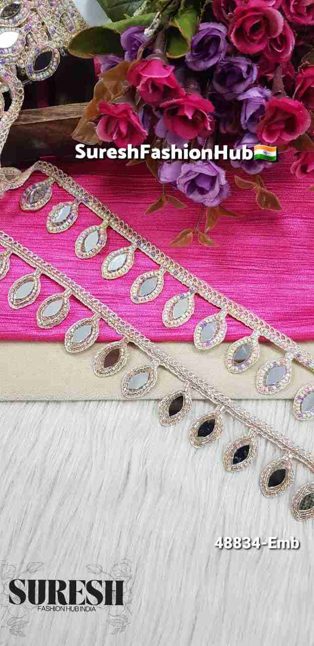 Design *48834-Emb* is a *luxury one-side dori border lace, beautifully crafted with **flowing dori embroidery* and enriched with *elegant bead detailing* that forms a refined, designer edge. The standout feature of this design is its *mirror highlights combined with a graceful hanging effect*, adding movement, shimmer, and a couture-inspired finish to any outfit.