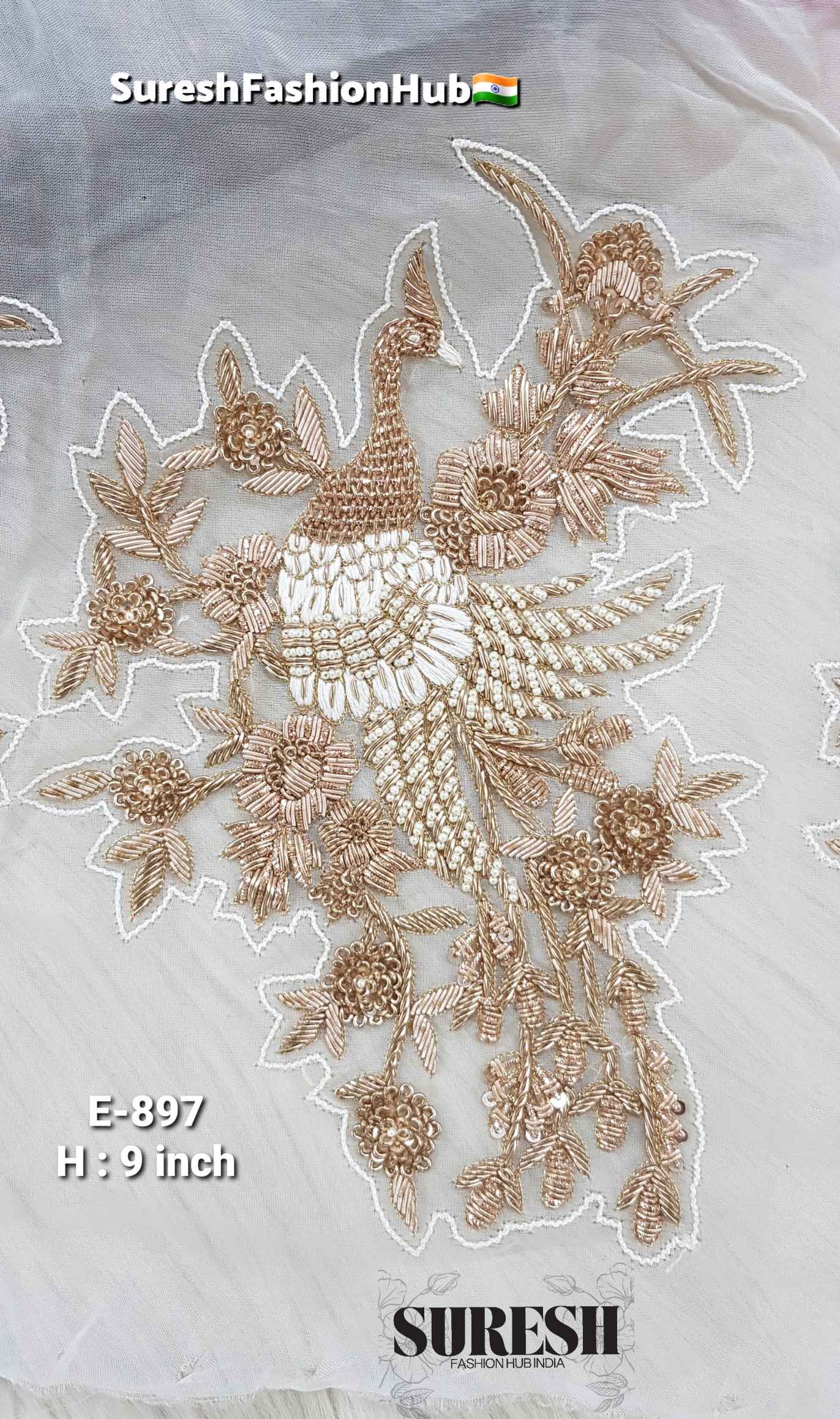 Introducing *Design No. E-897, a **very beautiful peacock floral patch* crafted in an elegant *rose pearl shade* on soft *organza fabric. The design features a graceful peacock surrounded by delicate floral elements, giving it a **royal, artistic, and luxurious appeal*.