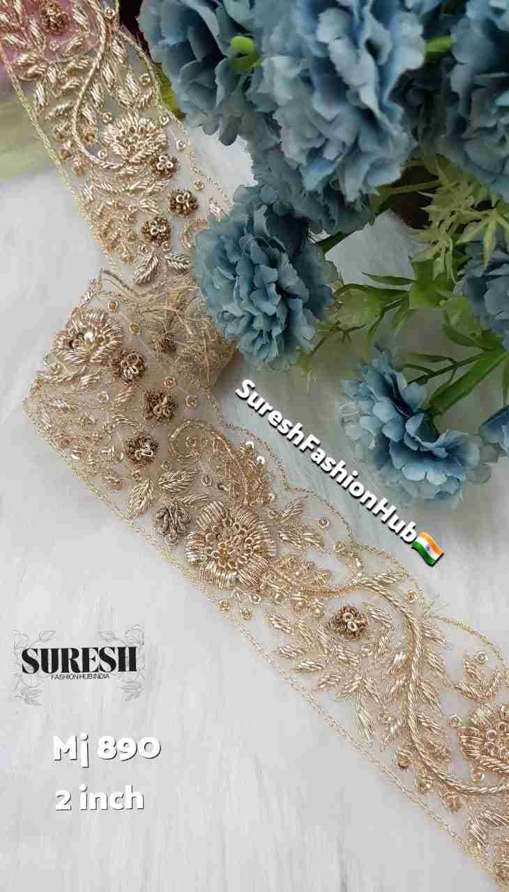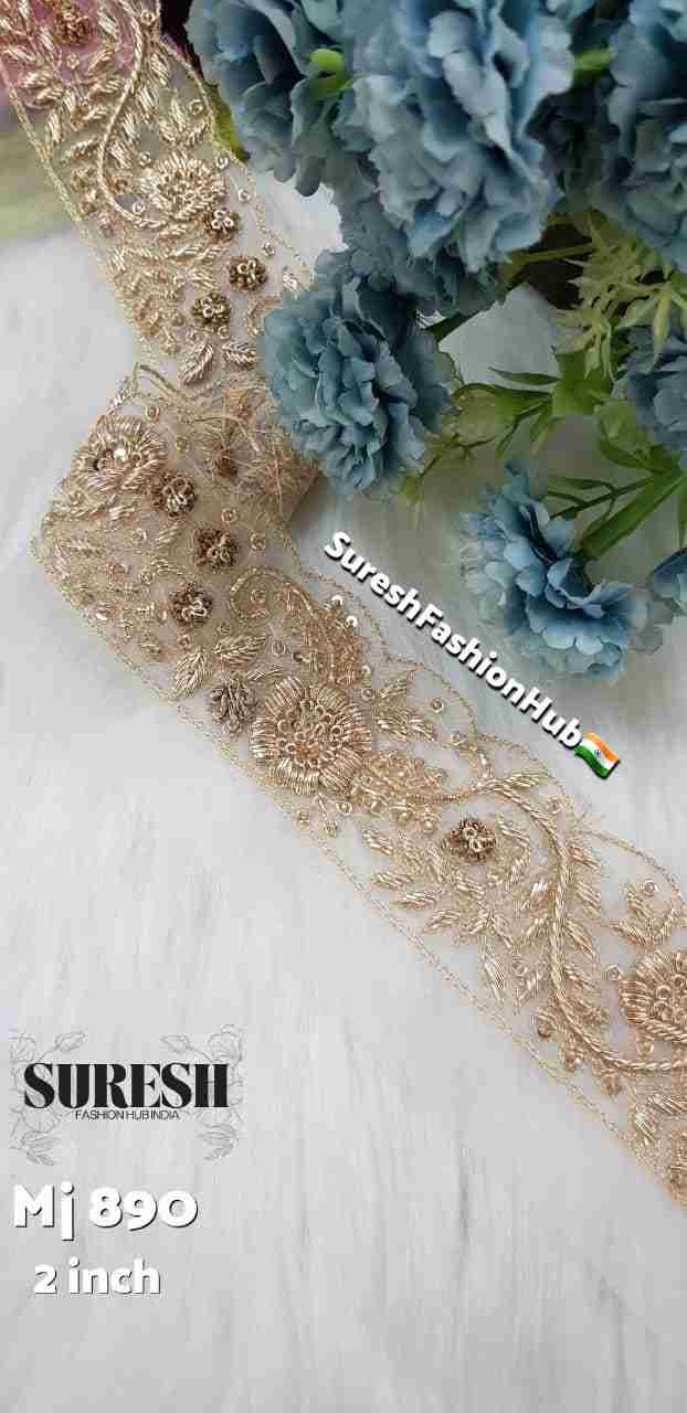 Presenting *Mj-890 – 2 Inch Handmade Designer Zardosi Lace, a statement border crafted for those who seek true luxury and exclusivity. This **100% handmade designer lace* stands out for its rich gold tone and breathtaking floral embroidery, making it an instant showstopper in any couture collection.