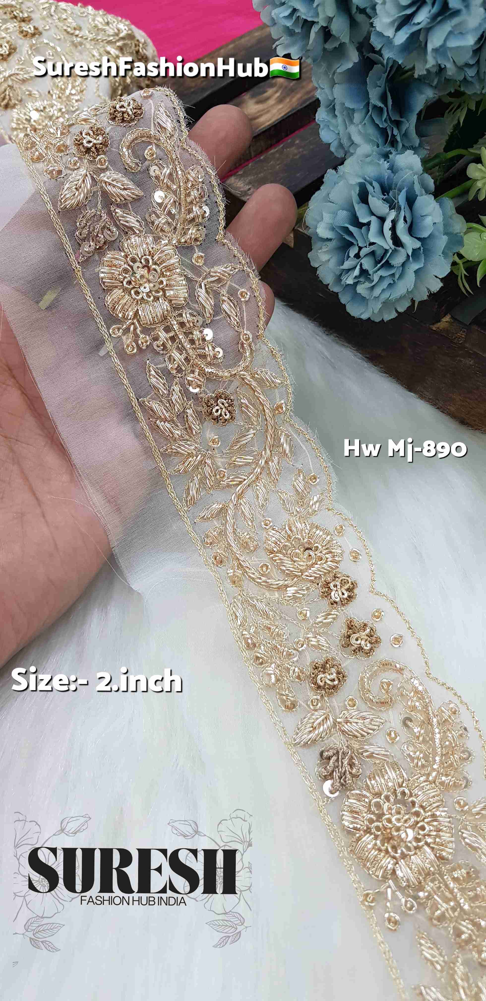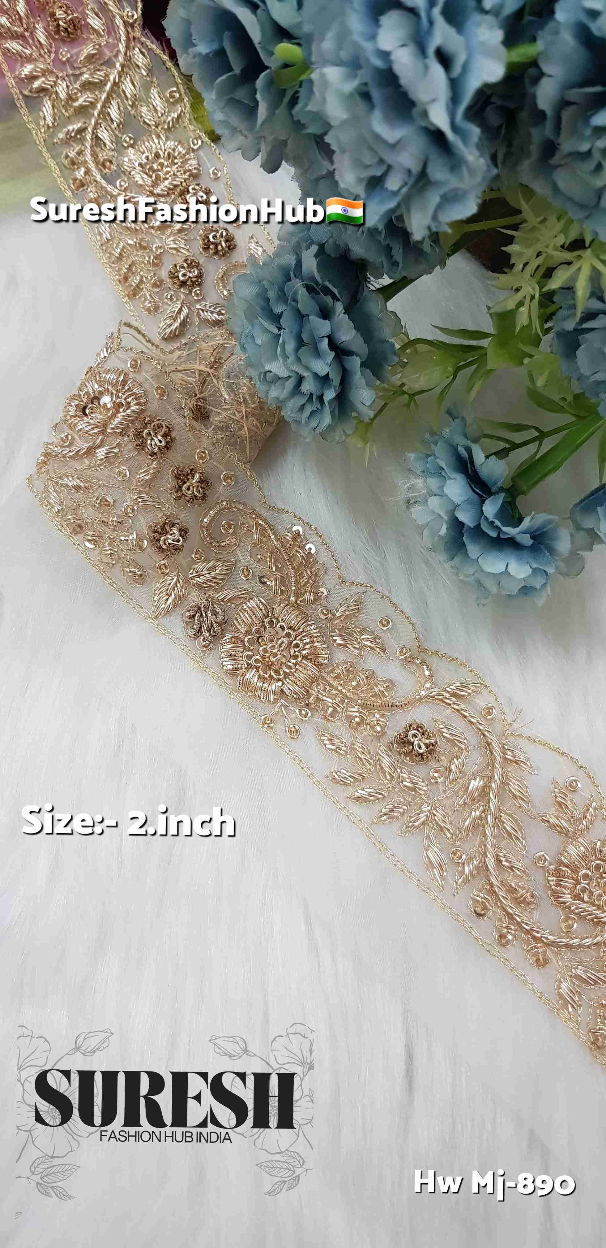 Presenting *Mj-890 – 2 Inch Handmade Designer Zardosi Lace, a statement border crafted for those who seek true luxury and exclusivity. This **100% handmade designer lace* stands out for its rich gold tone and breathtaking floral embroidery, making it an instant showstopper in any couture collection.