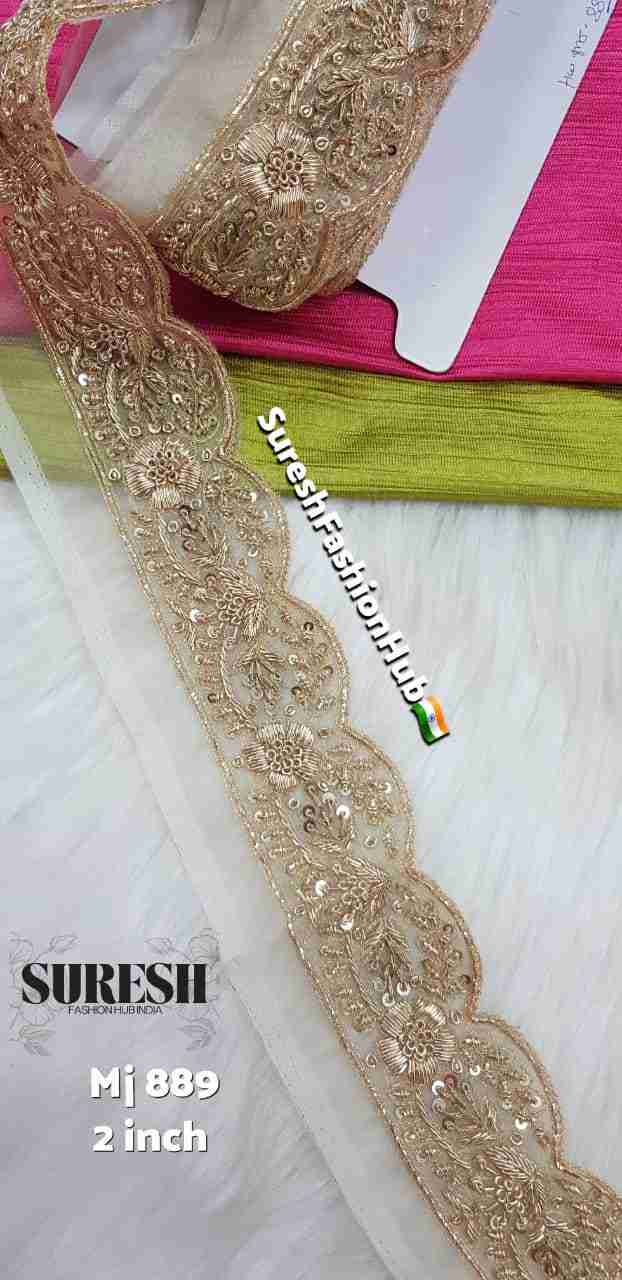Design *Mj-889* is a *luxury handmade designer Zardosi border lace* that reflects true craftsmanship and royal elegance. The first thing that captures attention is the *rich gold tone*, which brings a premium and timeless appeal to this exquisite border.