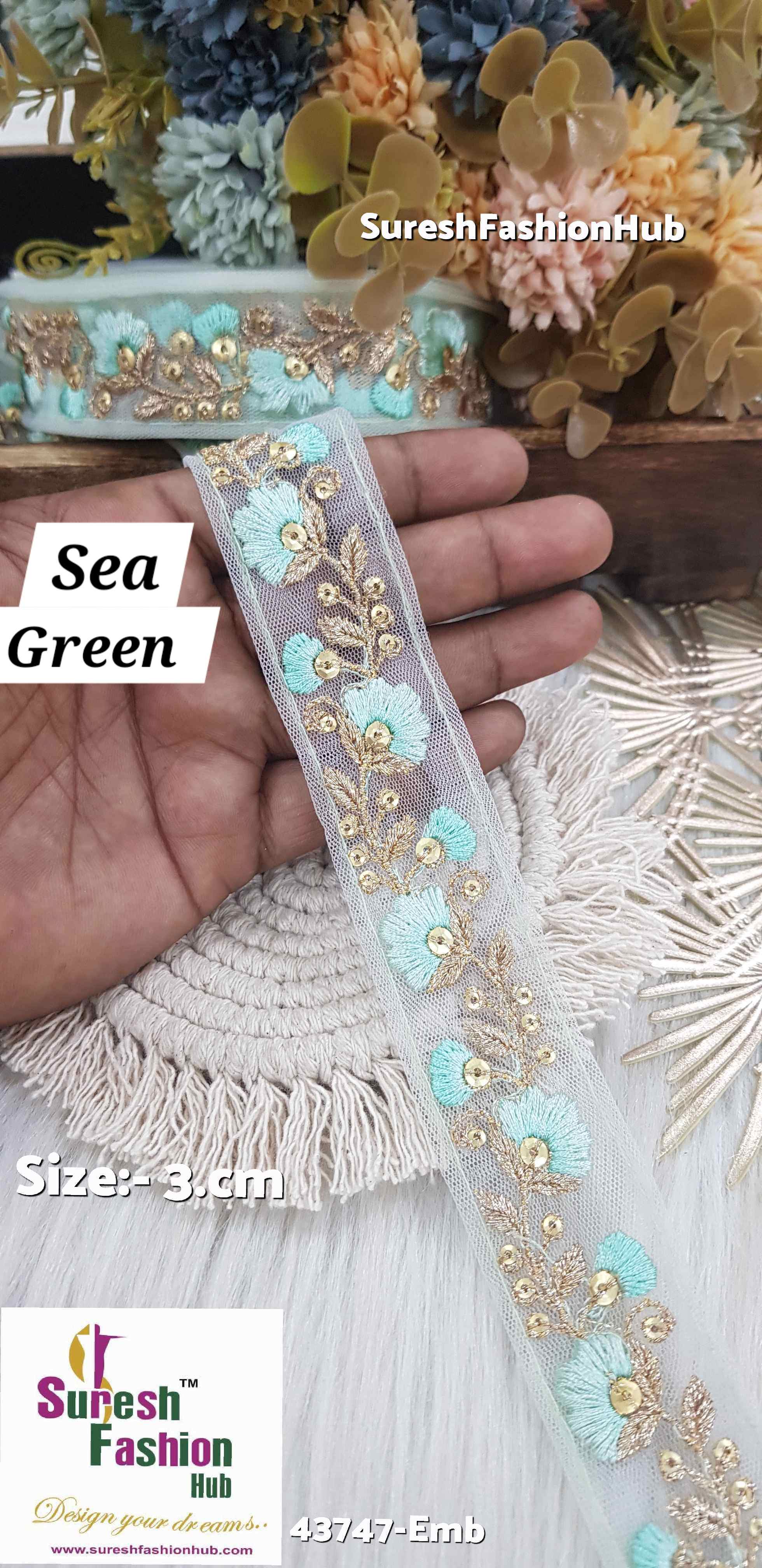 Indulge in the enchanting beauty of our Embroidery Lace collection - 43747-Emb. Crafted on delicate net fabric, each lace showcases a mesmerizing floral pattern embellished with threads, sequence, and shimmering jari. Available in four captivating colors - Sea Green, Rose Gold, Dark Pink, and Blue - these laces add a touch of elegance and charm to any project. Elevate your designs with the exquisite beauty of these intricately crafted laces, priced at Rs 300 for a generous 9-meter roll.