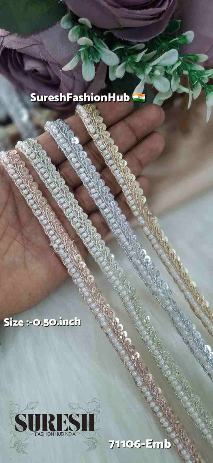 The design is enhanced with elegant pearls, fine dori work, and subtle sequins, creating a graceful texture that looks sophisticated and luxurious despite its minimal width. Its compact 0.5-inch size makes it extremely versatile, allowing it to be used creatively across multiple applications without overpowering the design.
