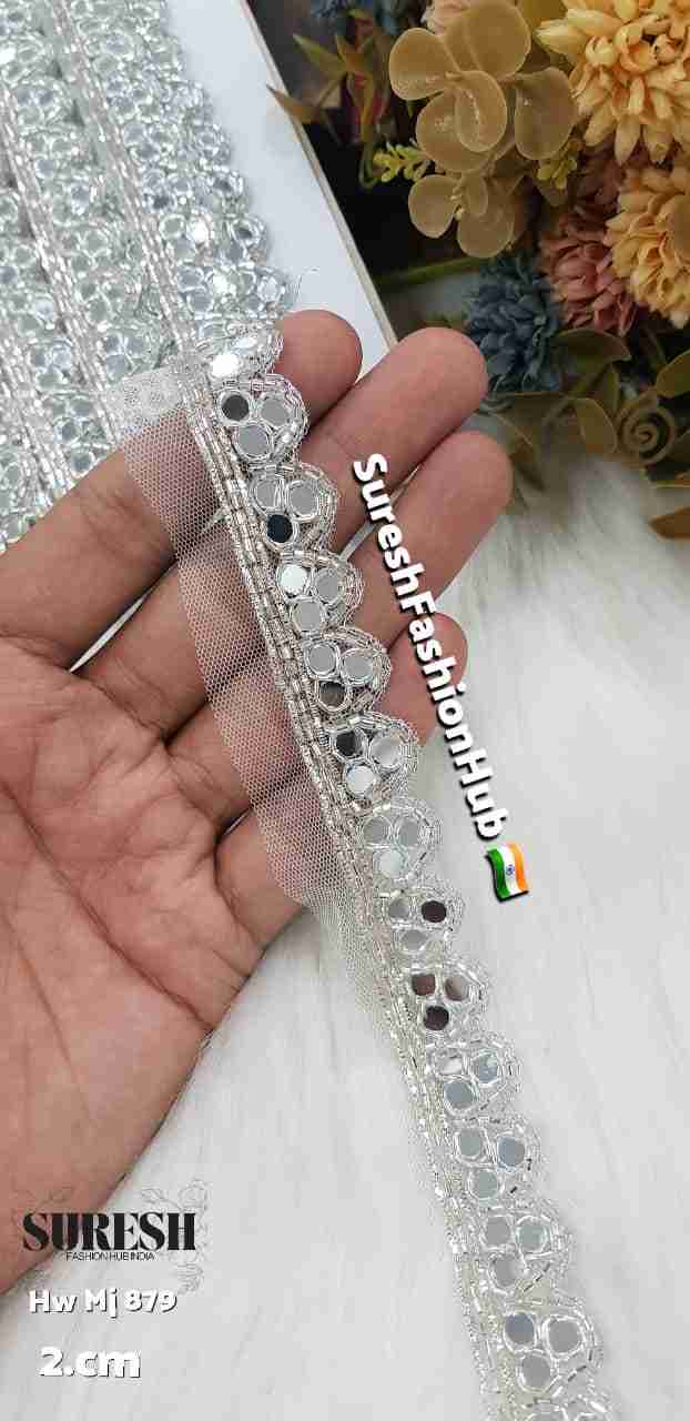 *Mj-879* is a *graceful, sparkling, and premium handmade border lace* that beautifully blends *traditional craftsmanship with modern mirror detailing, making it an excellent choice for **bridal, festive, and high-end designer fashion* ✨