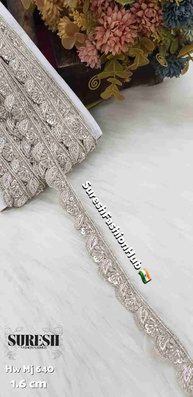 Design *Mj-640* is a *delicate and luxurious handmade cutwork border lace, crafted with precision on a fabric base to create a refined **one-side designer finish. The soft **Water Silver tone* gives this border a graceful shimmer that feels elegant yet modern, making it perfect for premium fashion applications.