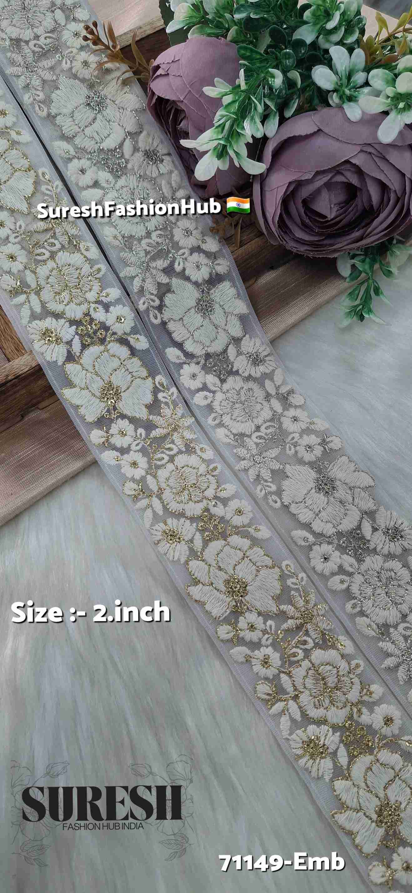 Design 71149-Emb is a beautiful Lakhnavi-style floral embroidery lace, delicately prepared on a fine net base using off-white threads to create a soft and graceful traditional look. This machine-crafted lace reflects the charm of classic Chikankari-inspired Lakhnavi patterns, enhanced with a modern luxury touch.