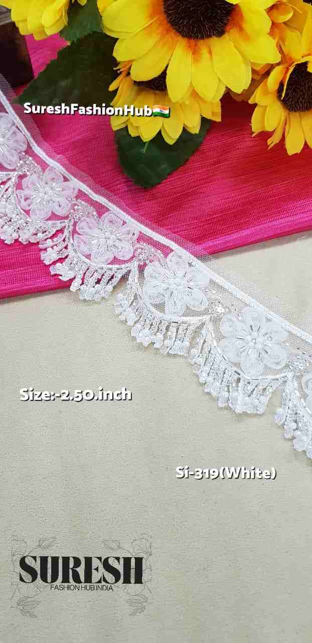 The *SI-319 fringe lace* beautifully blends floral elegance with a stylish hanging effect, making it ideal for modern ethnic and couture designs. Its movement, shine, and detailing make it a standout choice for premium fashion.