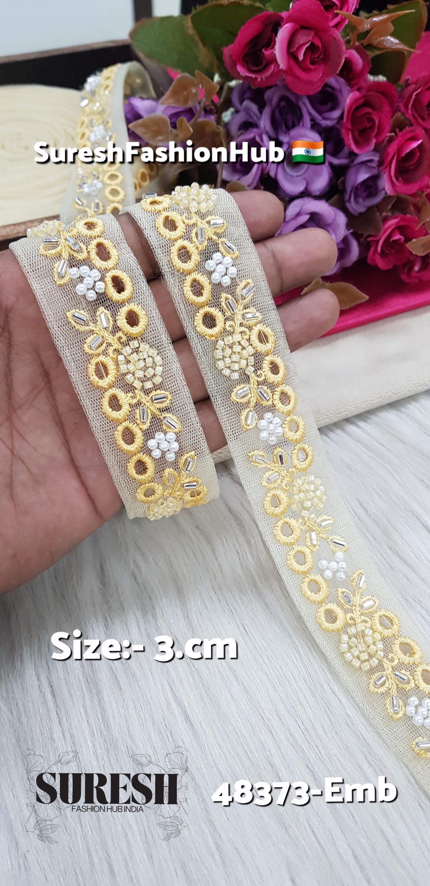 3cm embroidery lace, tone-to-tone net lace, machine hand embroidered lace, cutdana lace border, beads and pearl lace, designer lace wholesale India, 48373-EMB lace, net embroidery lace border, bridal lace trims India, SF India lace, Suresh Fashion Hub India lace, premium lace suppliers.