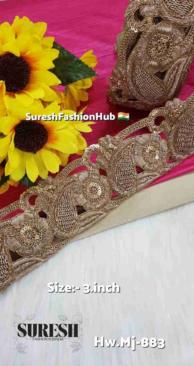 Mj-883 is a luxurious handmade Zardosi cutwork lace that beautifully blends traditional Keri motifs with elegant floral patterns, creating a timeless and royal design. Crafted on a fabric base, this lace showcases exceptionally neat hand-done cutwork, giving it a premium couture finish.